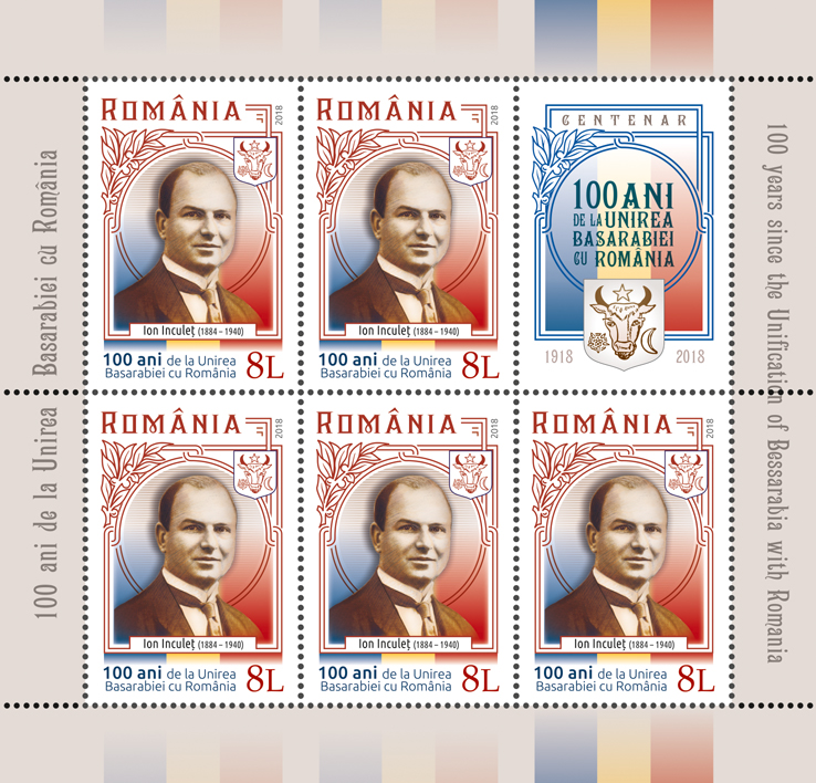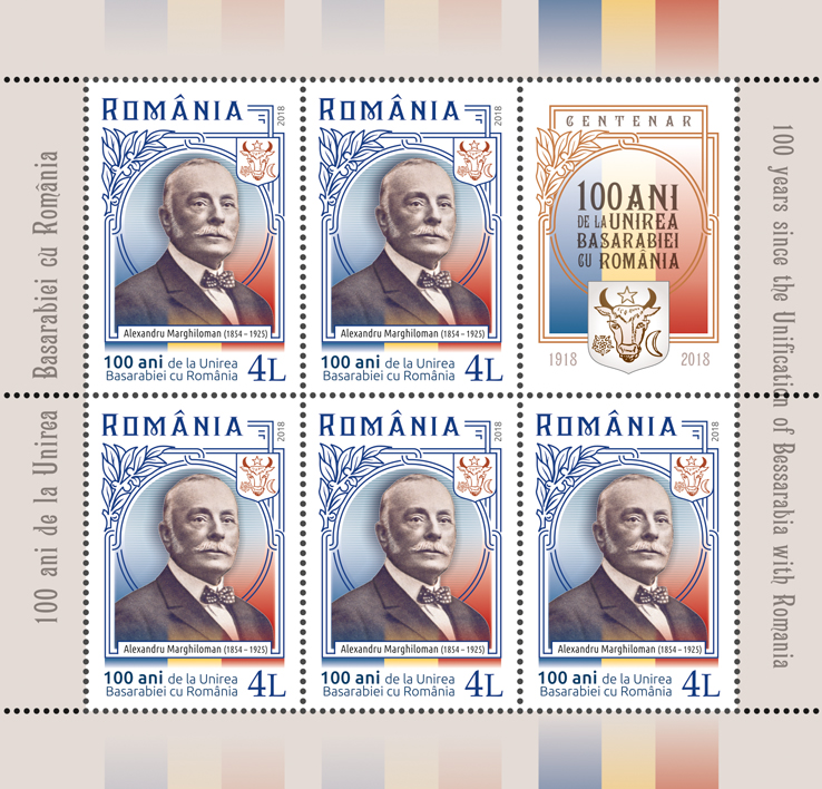 The stamps of the issue illustrate the portraits of three of the personalities who have contributed to the achievement of this national ideal. Thus, the stamp with the face value of Lei 4 shows the portrait of Alexandru Marghiloman, Prime Minister of Romania in March 1918. The portrait of Ion Inculet, president of the Chisinau Country Council, is reproduced on the stamp with the face value of Lei 8. The stamp of the perforated souvenir sheet of the postage stamp issue, with a face value of Lei 16, is illustrated with the portrait of Pantelimon Halippa, a fighter for the rights of the Romanians in the Tsarist Empire.