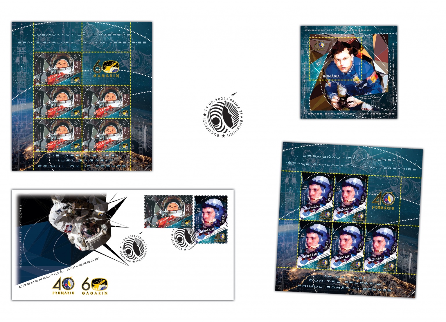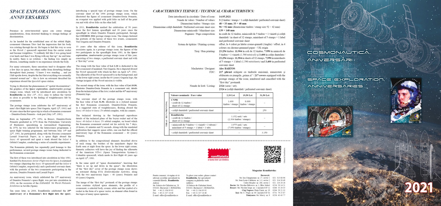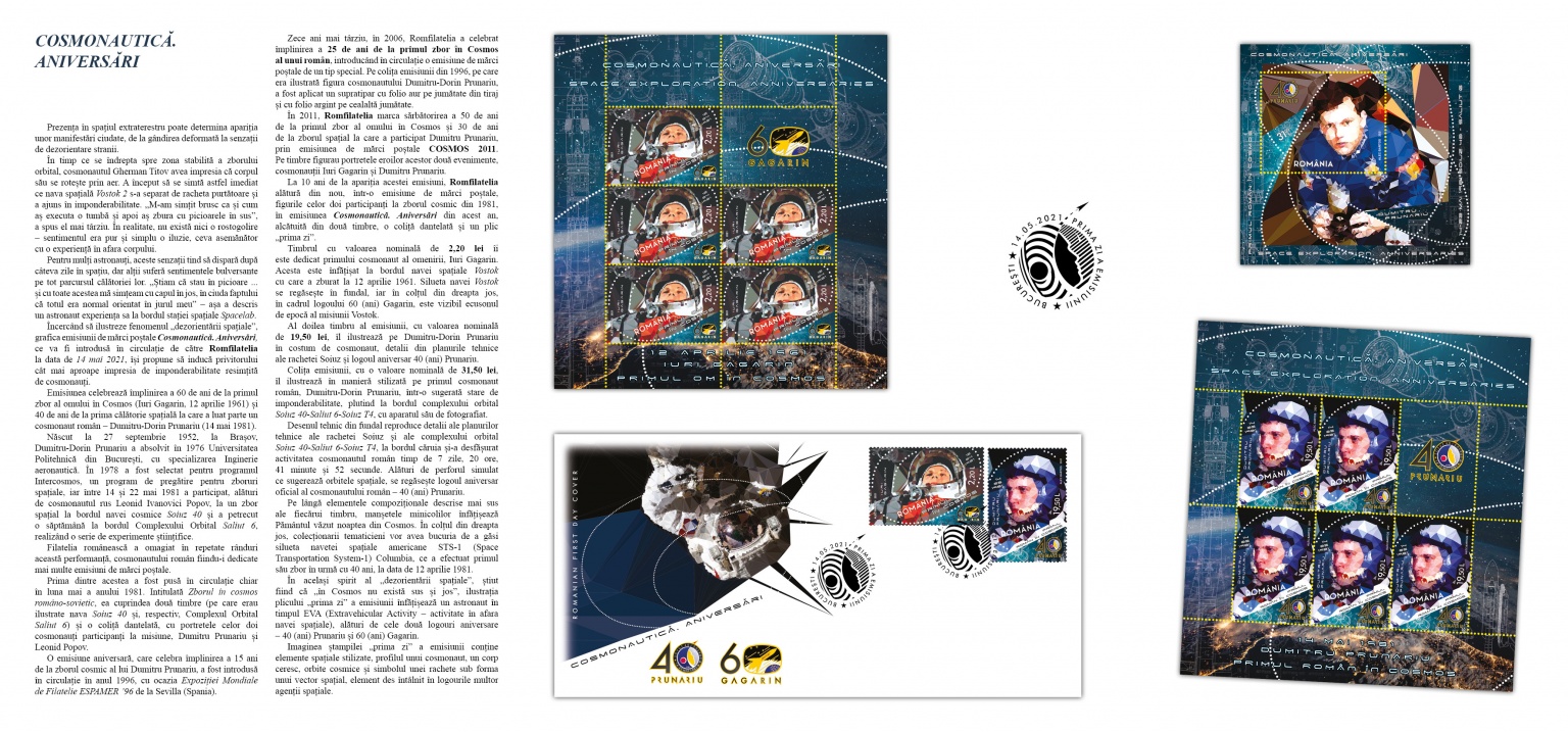 The postage stamps issue “Space exploration. Anniversaries” will be available on Friday, May 14th 2021, in Romfilatelia’s shops network in Bucharest, Bacau, Brasov, Cluj-Napoca, Iasi and Timisoara and online on https://romfilatelia.ro/store/.