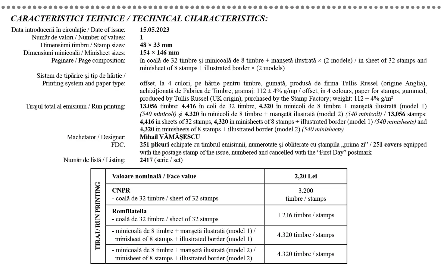 The philatelic issue will be available starting with Monday, May 15th, 2023, in Romfilatelia’s shops network in Bucharest, Bacău, Brașov, Cluj-Napoca, Iași and Timișoara and online on https://romfilatelia.ro/store/.
