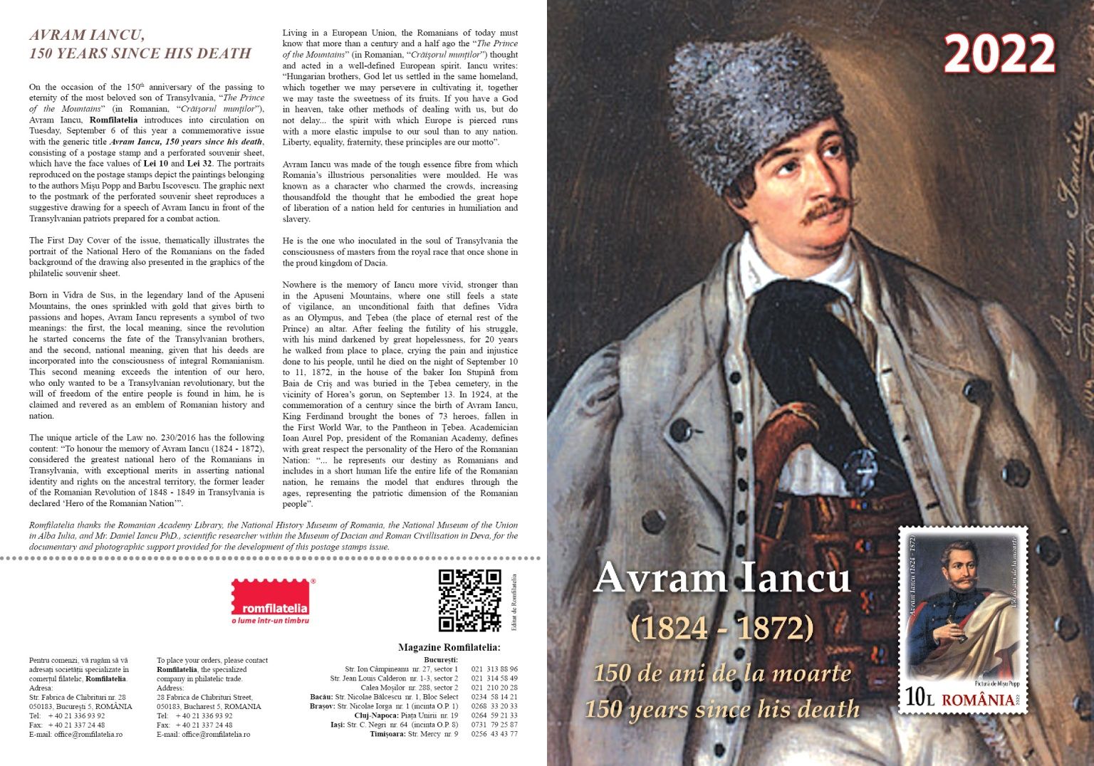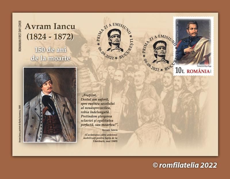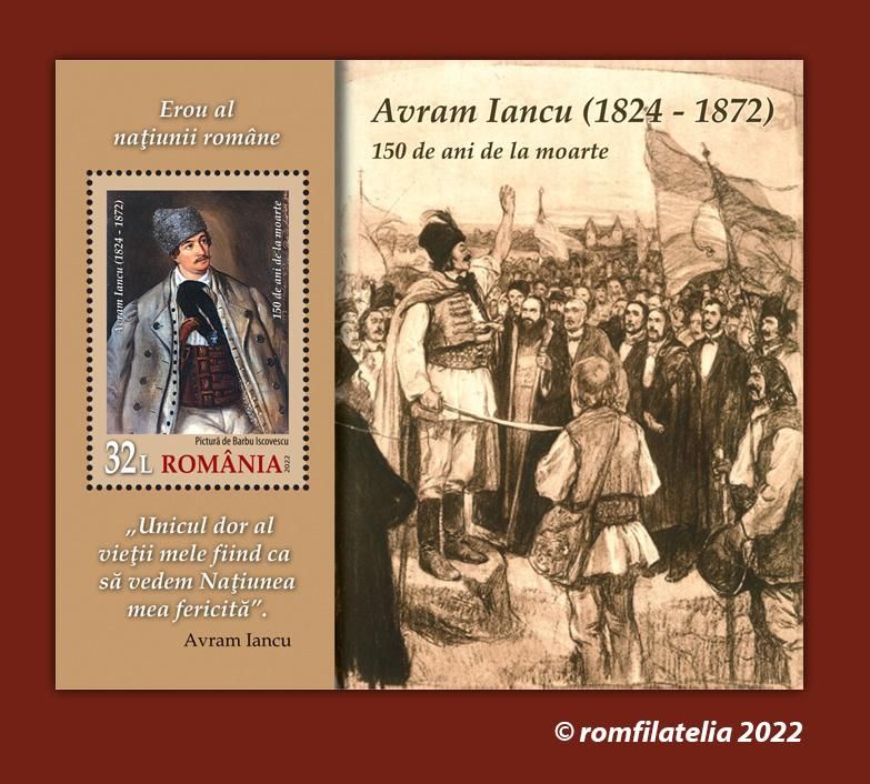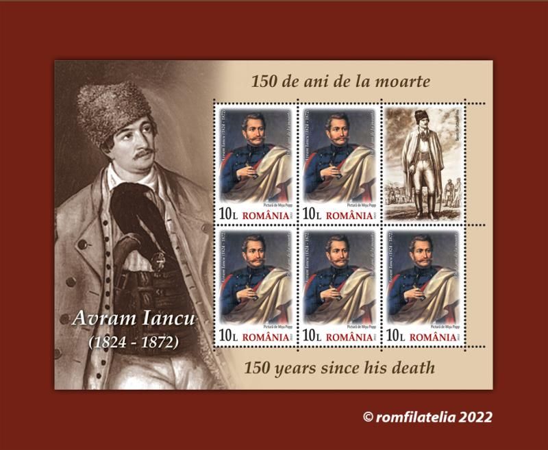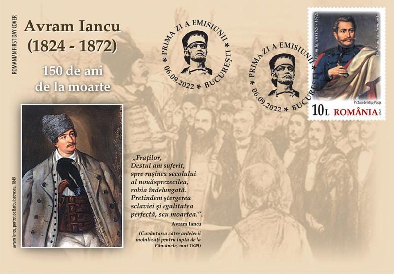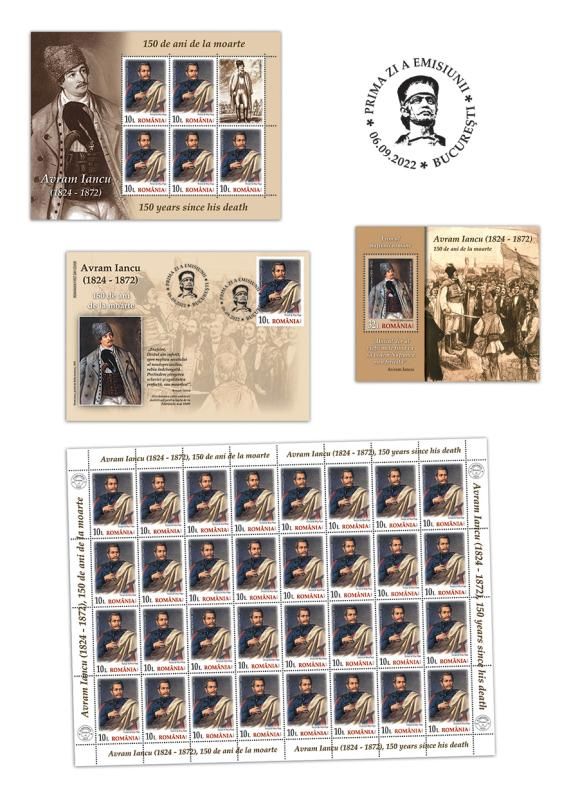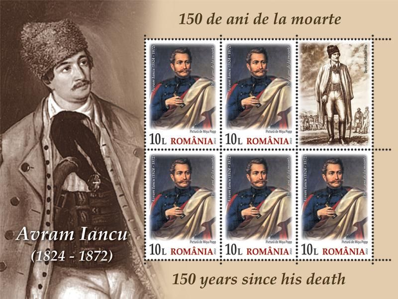 On the occasion of the 150th anniversary of the passing to eternity of the most beloved son of Transylvania, “The Prince of the Mountains” (in Romanian, “Crăişorul munţilor”), Avram Iancu, Romfilatelia introduces into circulation on Tuesday, September 6 of this year a commemorative issue with the generic title Avram Iancu, 150 years since his death.