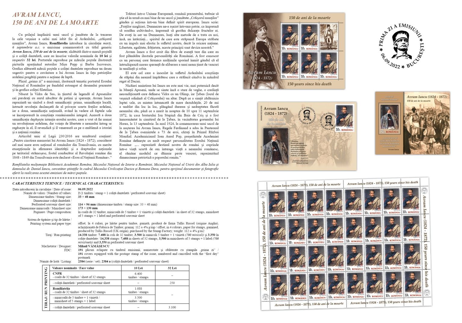 The portraits reproduced on the postage stamps depict the paintings belonging to the authors Mișu Popp and Barbu Iscovescu. The graphic next to the postmark of the perforated souvenir sheet reproduces a suggestive drawing for a speech of Avram Iancu in front of the Transylvanian patriots prepared for a combat action.