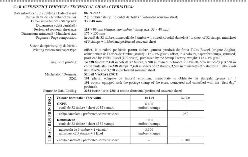 The philatelic issue will be available starting Tuesday, 6th of September, in Romfilatelia’s shops network in Bucharest, Bacau, Brasov, Cluj-Napoca, Iasi and Timisoara and online on https://romfilatelia.ro/store/.