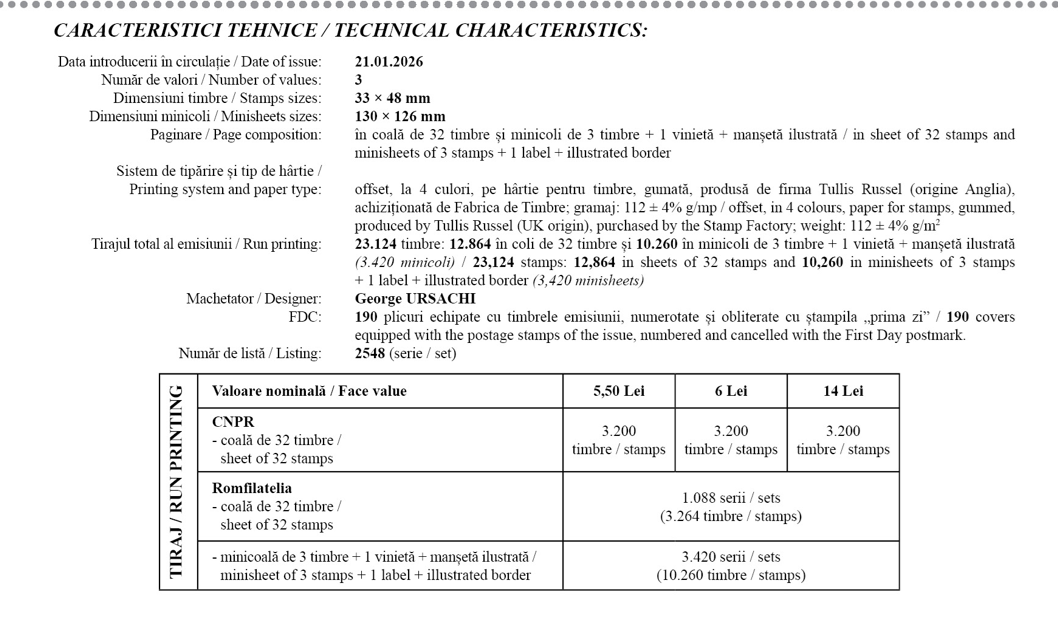 Romfilatelia thanks Prof. Paulina Anastasiu, PhD, Director of the ‘Dimitrie Brandza’ Botanical Garden of the University of Bucharest, for the documentary support provided in the development of this postage stamp issue.