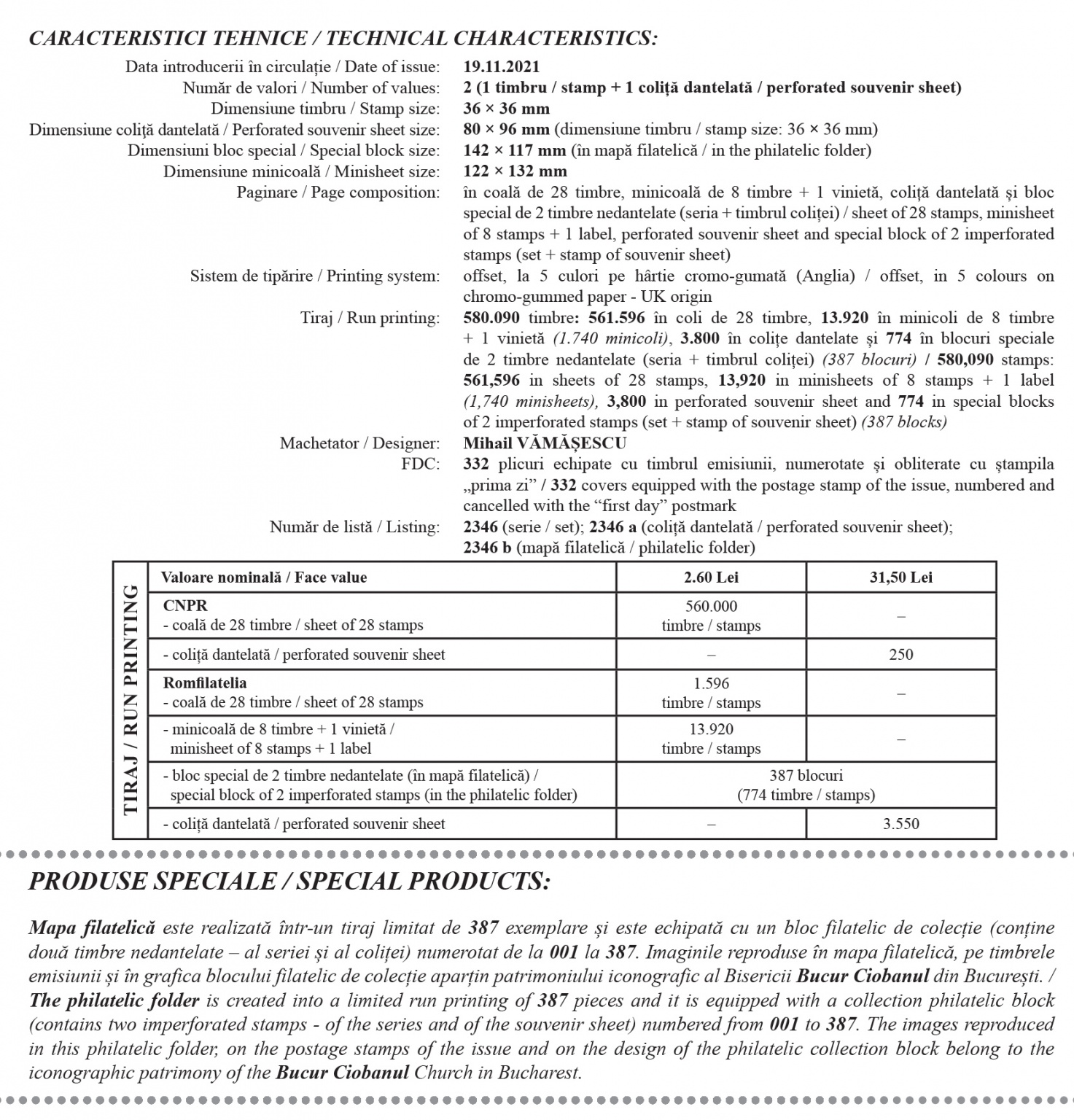 The issue consists of a postage stamp with the face value of Lei 2.60, a perforated souvenir sheet, having the stamp with the face value of Lei 31.50, a First Day Cover and collection philatelic bloc inserted in a special philatelic folder.