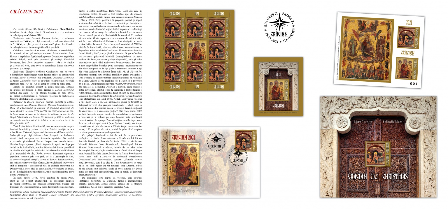 The philatelic issue dedicated to Christmas has as a source of images the reproduction of some icons from the patrimony of Bucur Ciobanul Church in Bucharest: The Birth of Jesus Christ and the Virgin Mary, which belonged to the church iconostasis painted in 1704 and 1705 by an iconographer named Ioan.
