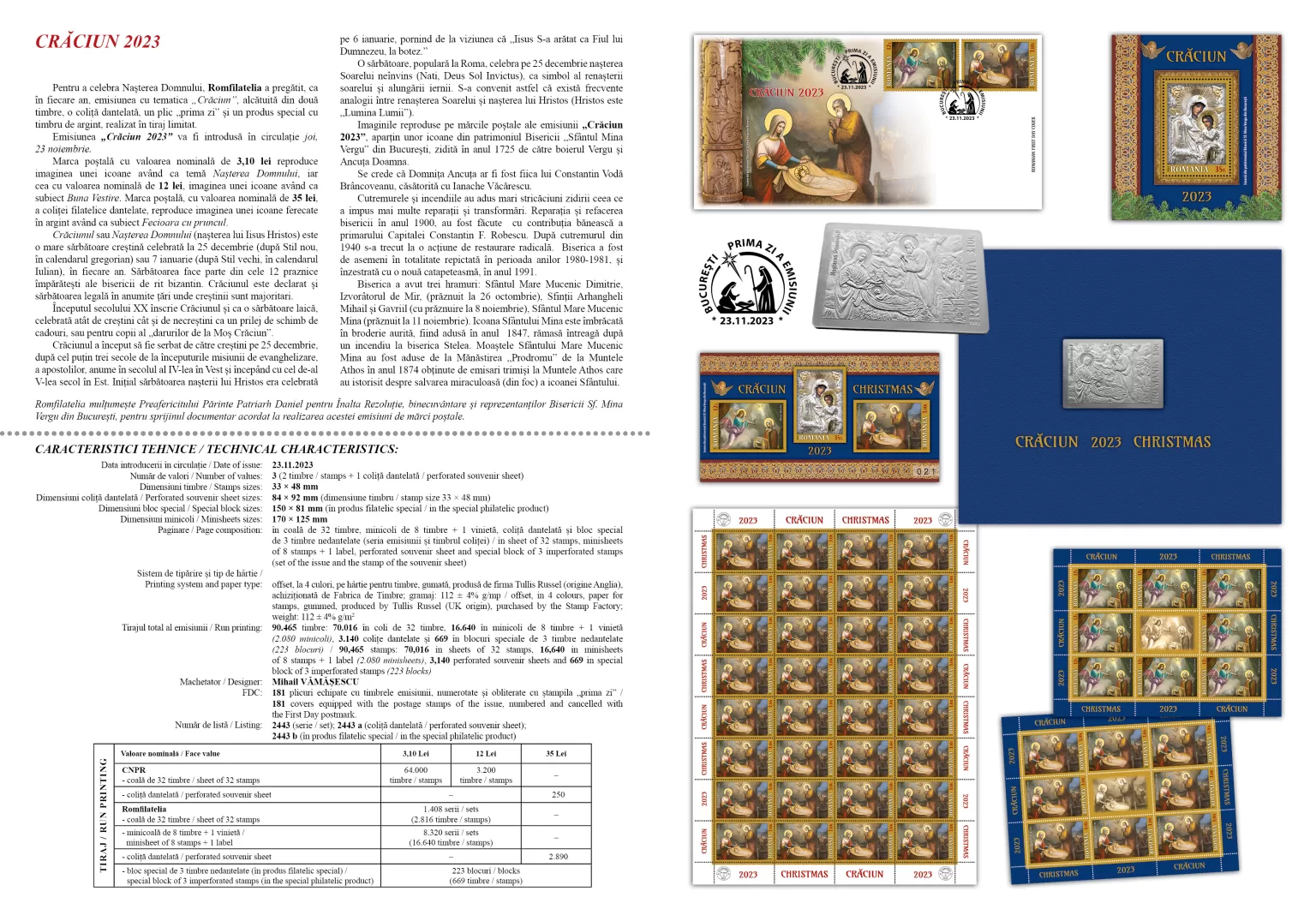 The images reproduced on the postage stamps of the „Christmas 2023” issue belong to icons from the patrimony of the “Saint Mina Vergu” Church in Bucharest, built in 1725 by the boyar Vergu and Ancuța Doamna (Lady Ancuța).