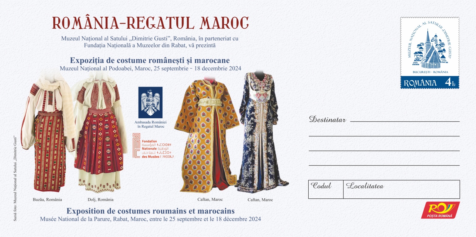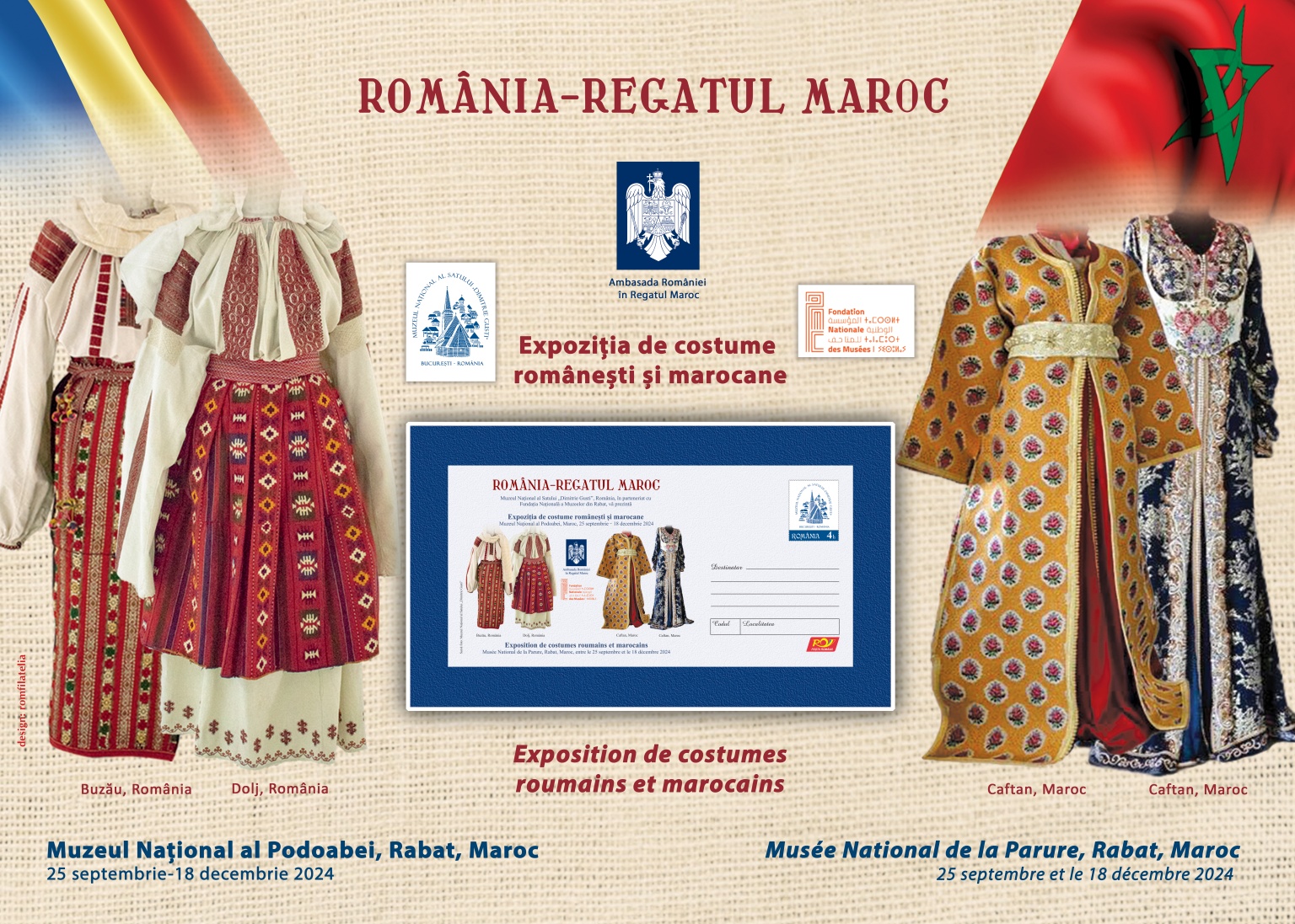 Romfilatelia, together with the ‘Dimitrie Gusti’ National Village Museum, in collaboration with the Romanian Embassy in the Kingdom of Morocco, launched the special philatelic product dedicated to the Exhibition of Romanian and Moroccan Costumes taking place in Rabat between September 25th and December 18th this year.