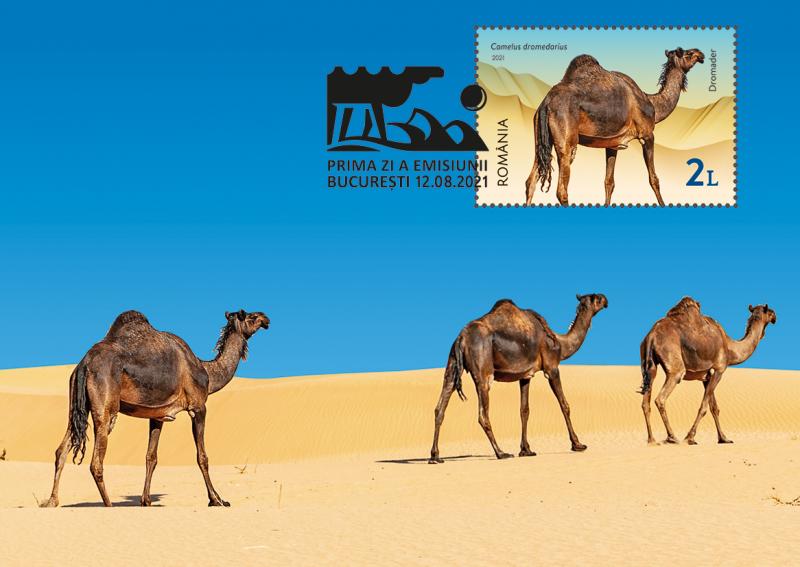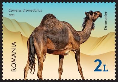 On the first stamp of the series, with the face value of Lei 2.00, is illustrated the dromedary (Camelus dromedarius). This herbivorous mammal has a single hump, in which fat is stored, which serves as a source of energy during periods without food. It lives mainly in the hot and arid areas of North and East Africa, as well as in Asia – in its centre and west and in the Indian subcontinent.