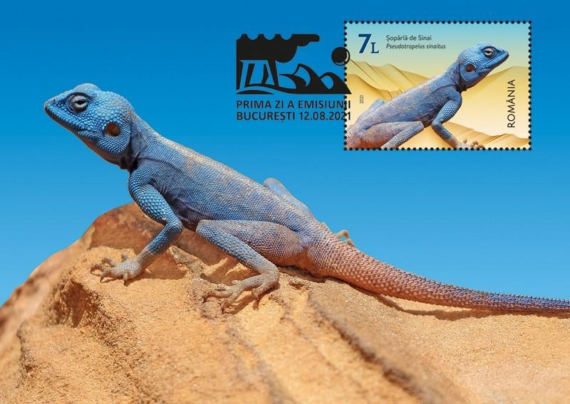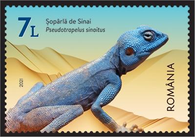 The Sinai agama (Pseudotrapelus sinaitus) is represented on the stamp with the face value of Lei 7.00. It is a small reptile, up to 18 cm, that lives in arid areas of north-eastern Africa and southwest Asia.