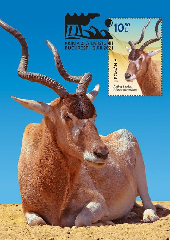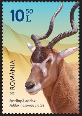 The addax antelope (Addax nasomaculatus) is illustrated on the stamp with the face value of Lei 10.50. It is a species native to the Sahara, very well adapted to the conditions of life in the desert. It can survive for a long time without drinking water, obtaining the necessary water from dew and the plants it feeds on. Once widespread in North Africa, the addax antelope is now a critically endangered species, a large number of specimens being bred in captivity.