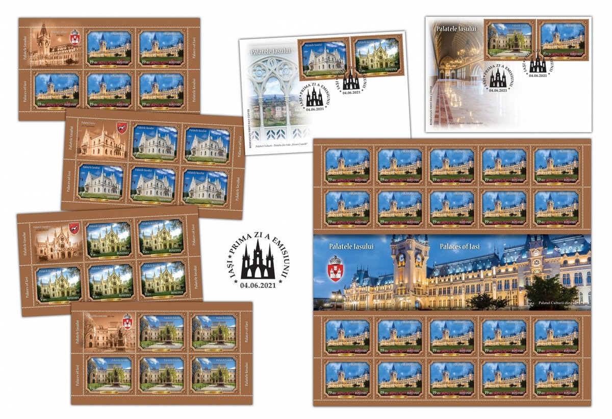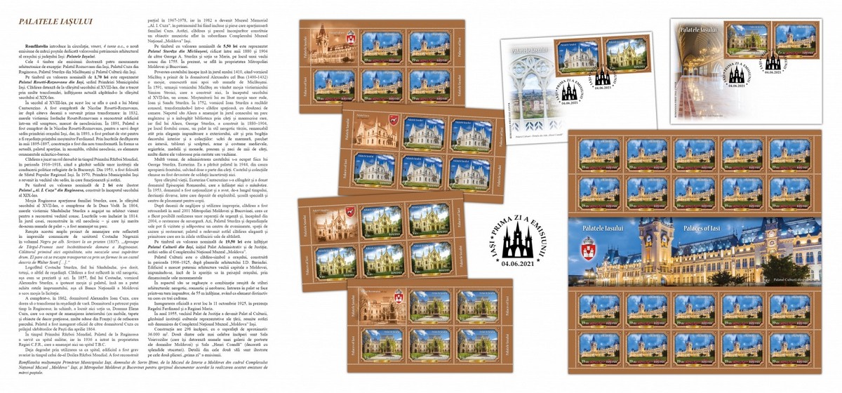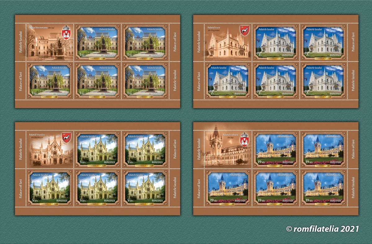The stamps of the issue illustrate four exceptional architectural monuments: Roznovanu Palace in Iasi, Cuza Palace in Ruginoasa, Sturdza Palace in Miclauseni and the Palace of Culture in Iasi.