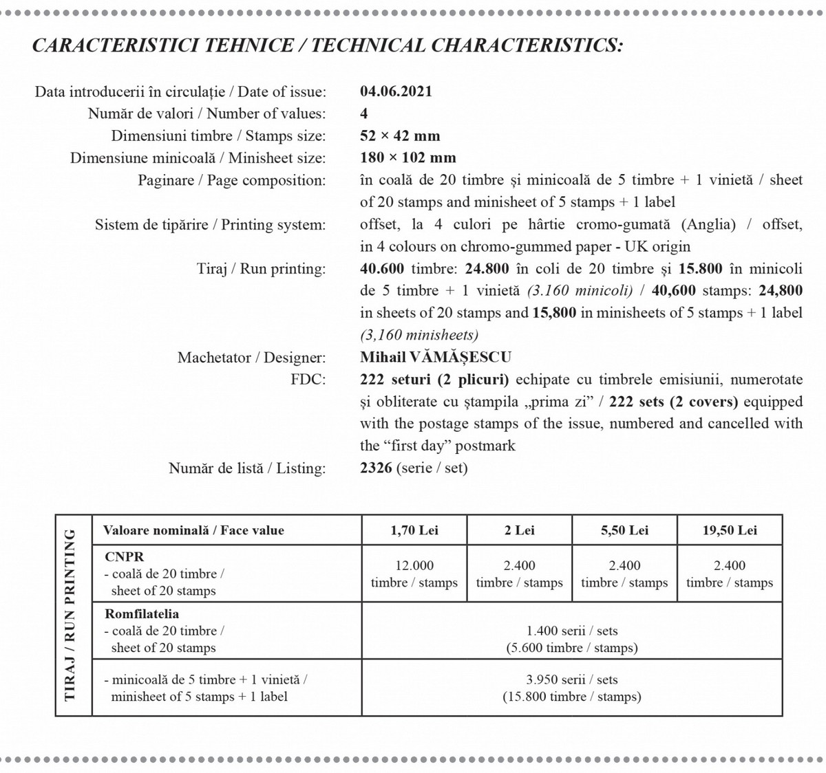 The postage stamp issue will be available on Friday, June 4th 2021, in Romfilatelia’s shops network in Bucharest, Bacau, Brasov, Cluj-Napoca, Iasi and Timisoara and online on https://romfilatelia.ro/store/. The postage stamp issue is completed by two “first day” covers, sheet of 20 stamps and minisheet of 5 stamps + 1 label.
