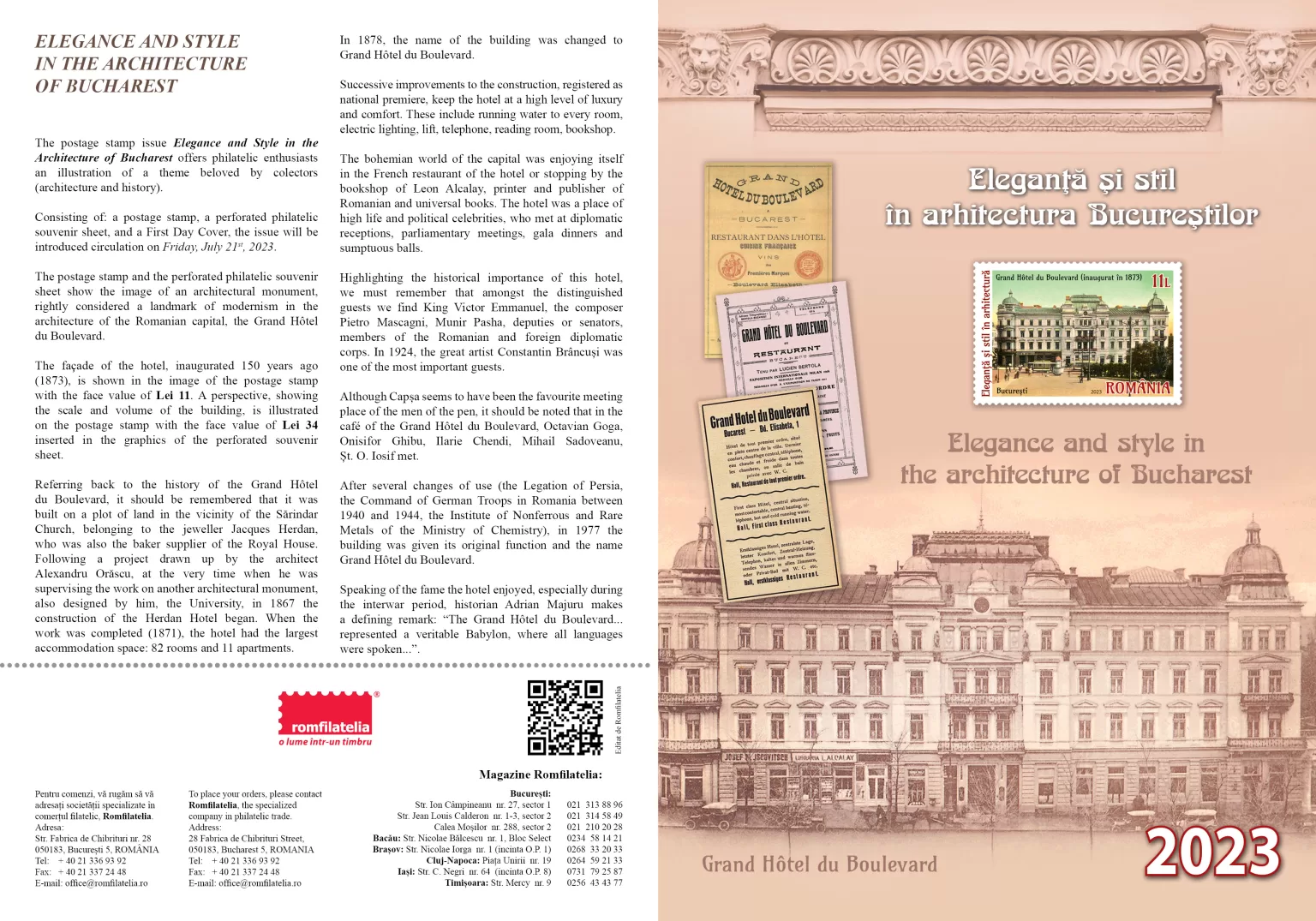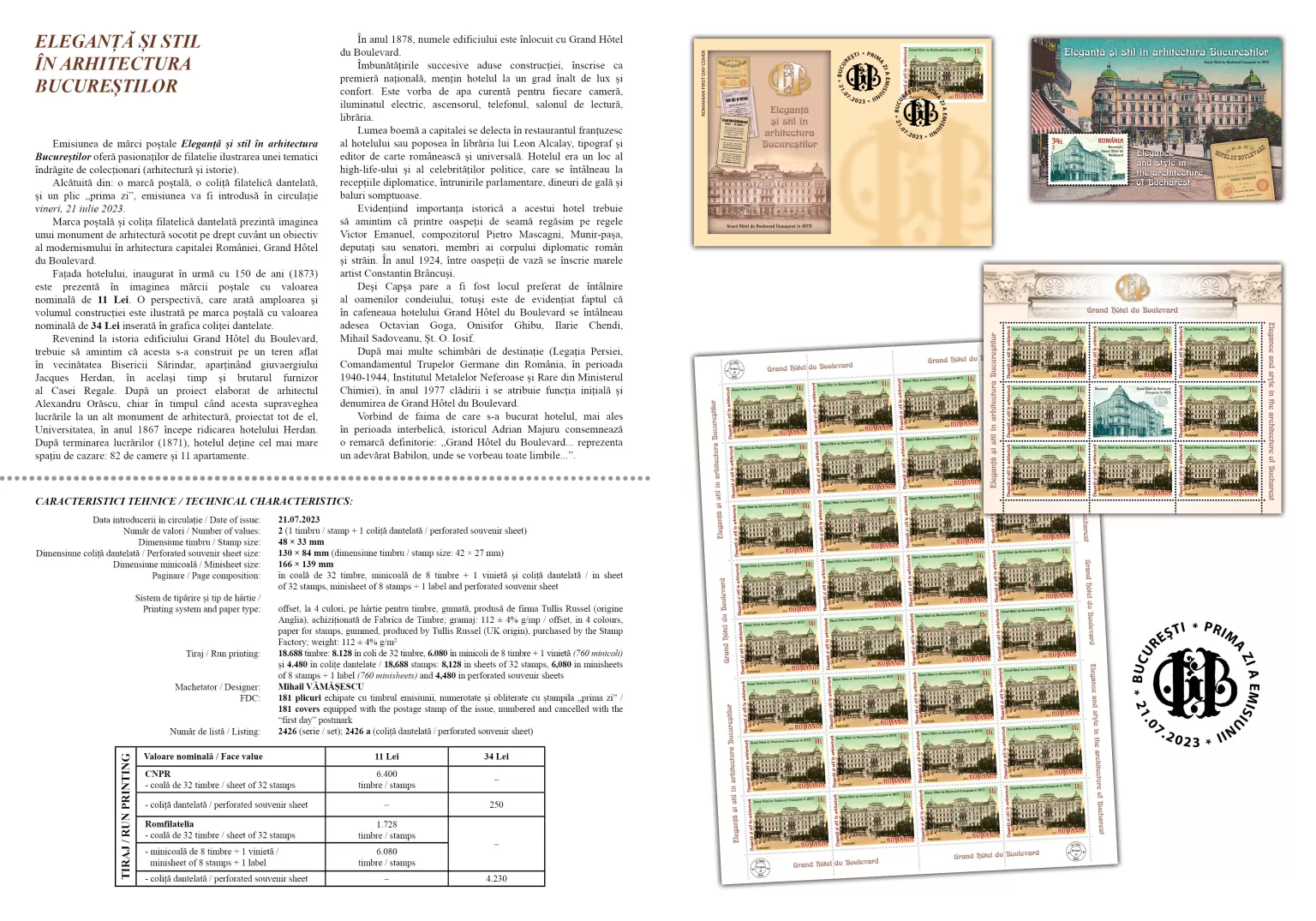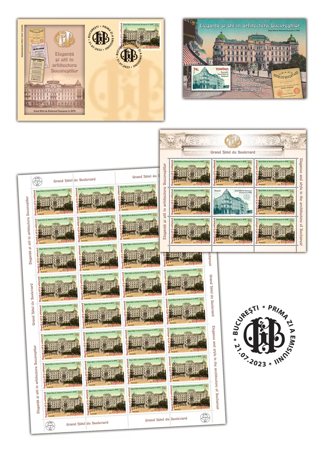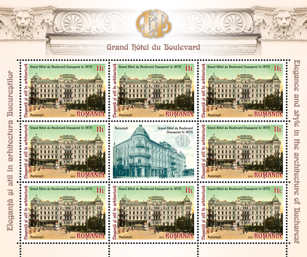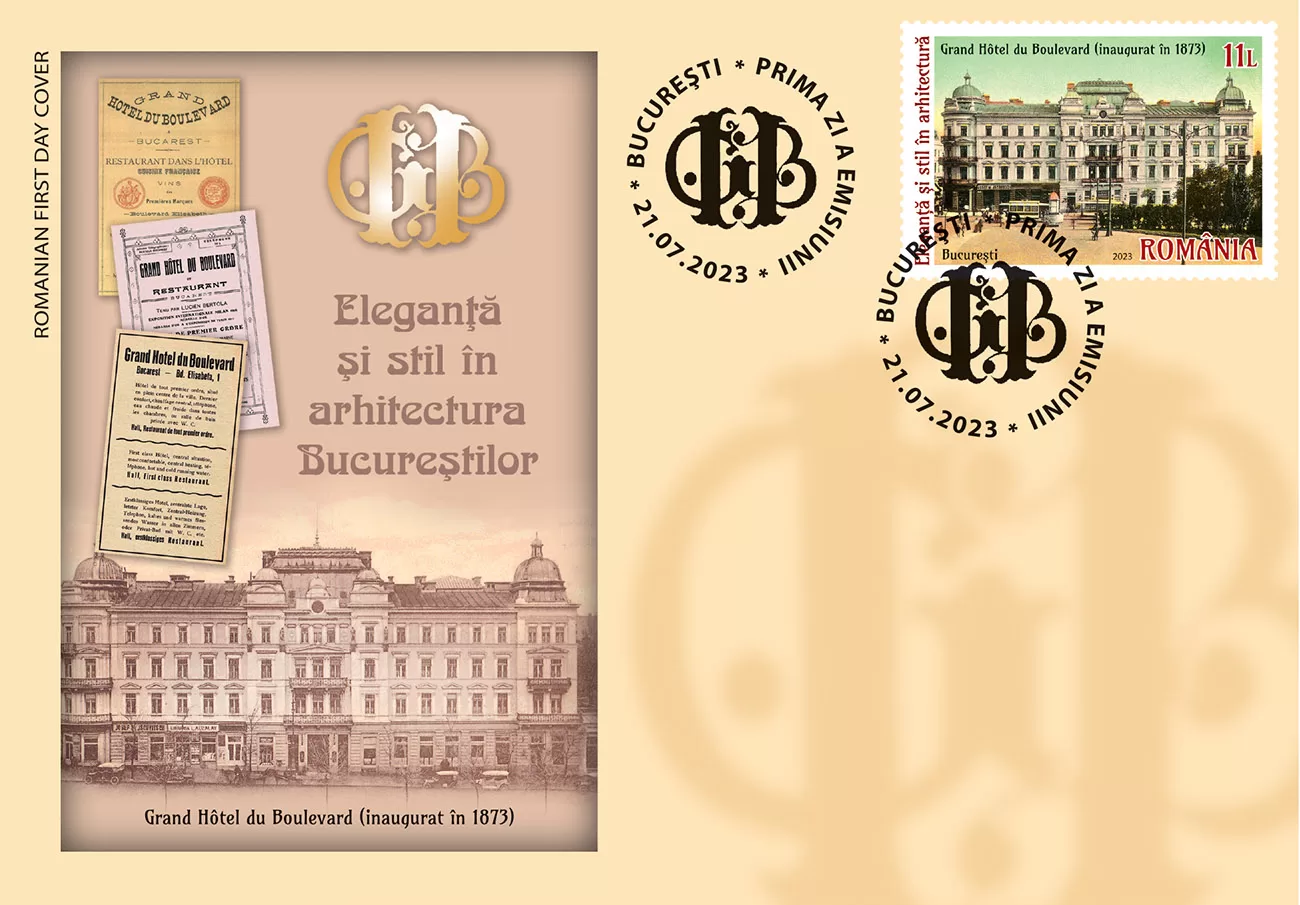 The façade of the hotel, inaugurated 150 years ago (1873), is shown in the image of the postage stamp with the face value of Lei 11. A perspective, showing the scale and volume of the building, is illustrated on the postage stamp with the face value of Lei 34 inserted in the graphics of the perforated souvenir sheet.