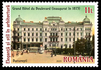 The postage stamp and the perforated philatelic souvenir sheet show the image of an architectural monument, rightly considered a landmark of modernism in the architecture of the Romanian capital, the Grand Hôtel du Boulevard.