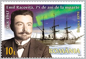 On the stamp of the issue with the face value of Lei 10, the portrait of the scientist at the age of adulthood is illustrated in the foreground, and on the background the ship of the Belgica Expedition, anchored between the shores of Antarctica.