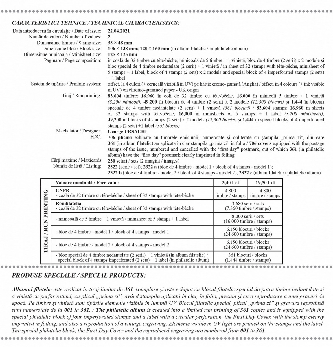 The postage stamps issue will be available on Thursday, April 22nd, 2021, in Romfilatelia’s shops network in Bucharest, Bacau, Brasov, Cluj-Napoca, Iasi and Timisoara and online on https://romfilatelia.ro/store/.