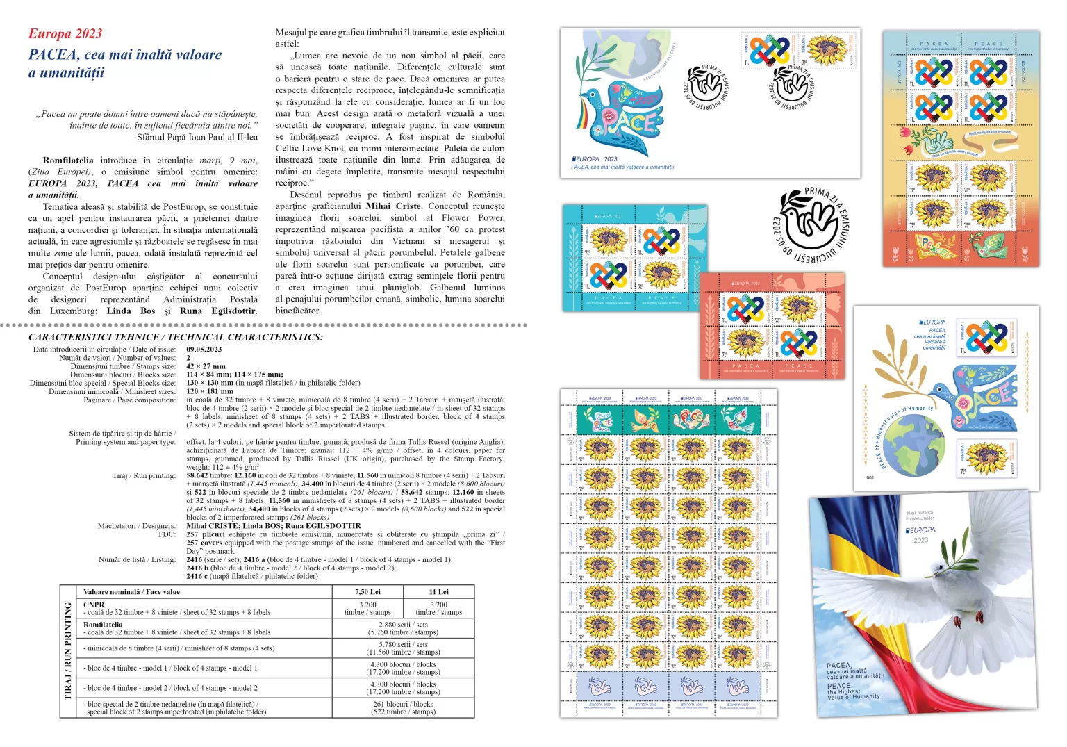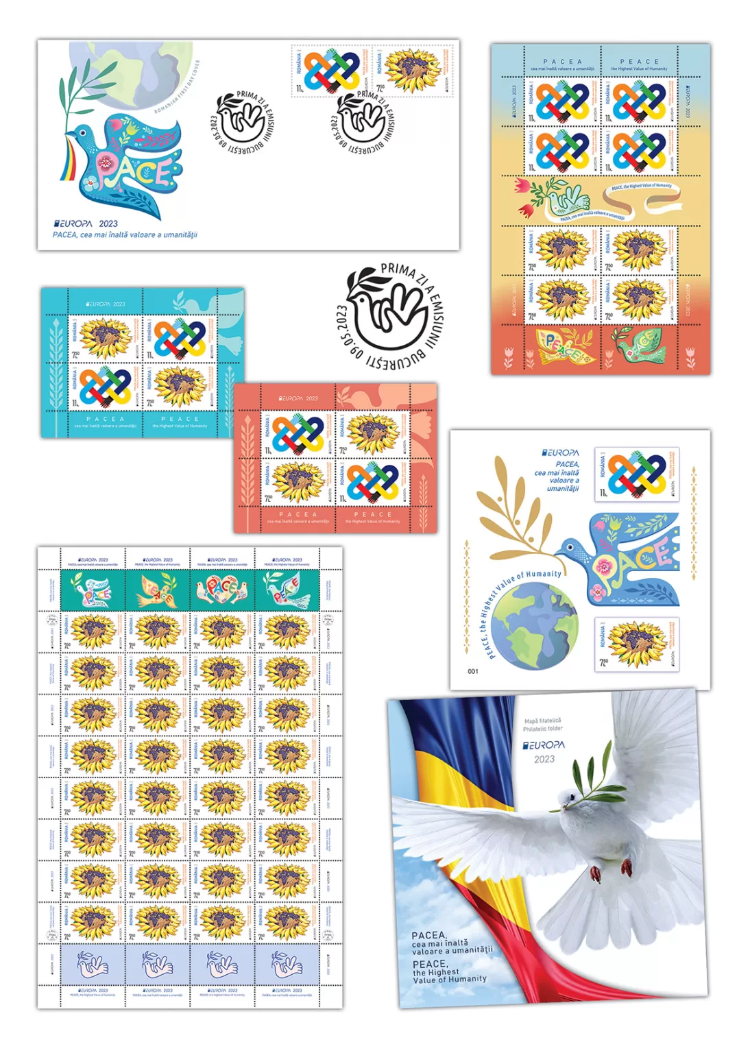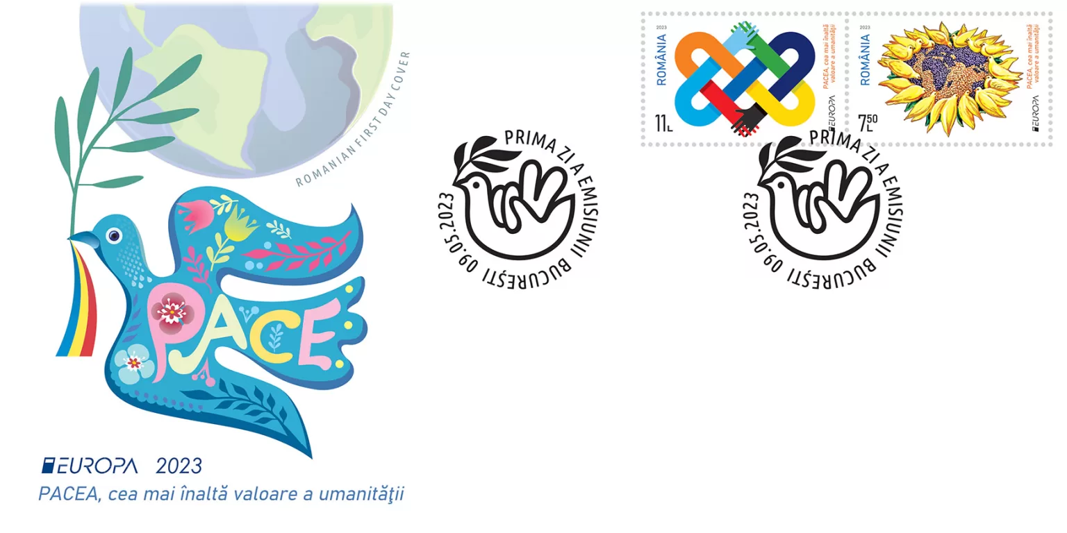 Romfilatelia introduces into circulation on Tuesday, 9 May (Europe Day), a symbol issue for humankind: Europa 2023. PEACE – The Highest Value of Humanity.