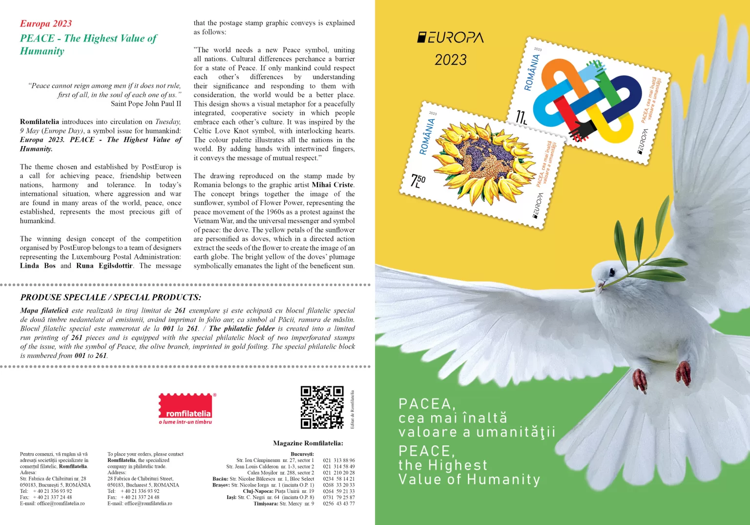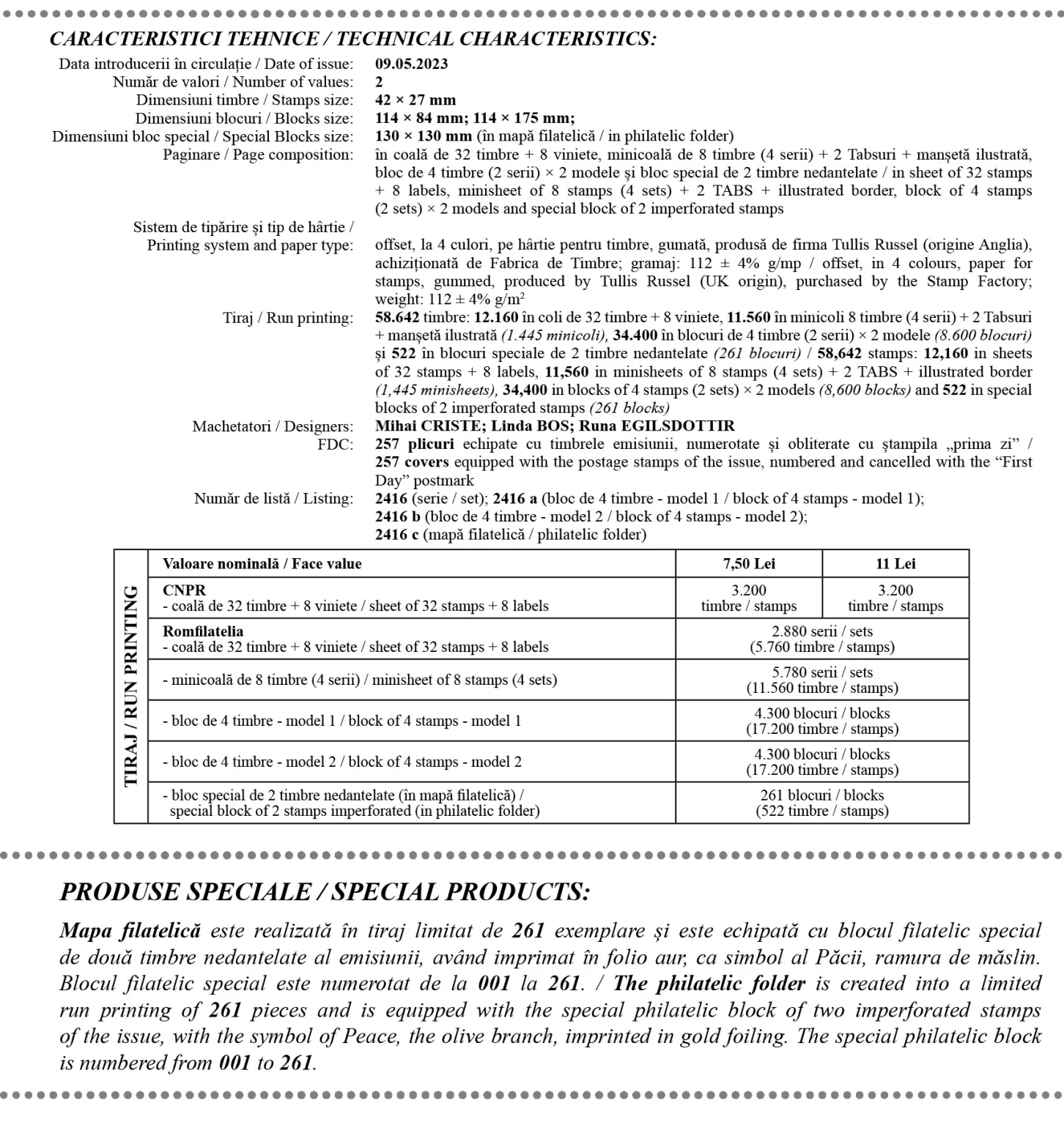 The philatelic issue will be available starting with Thursday, May 09th, 2023, in Romfilatelia’s shops network in Bucharest, Bacău, Brașov, Cluj-Napoca, Iași and Timișoara and online on https://romfilatelia.ro/store/.