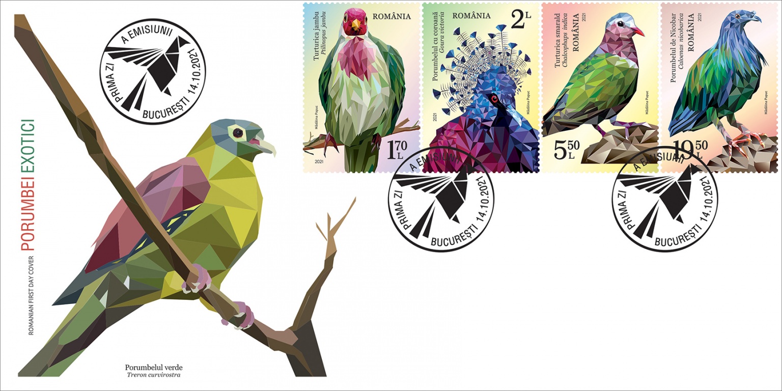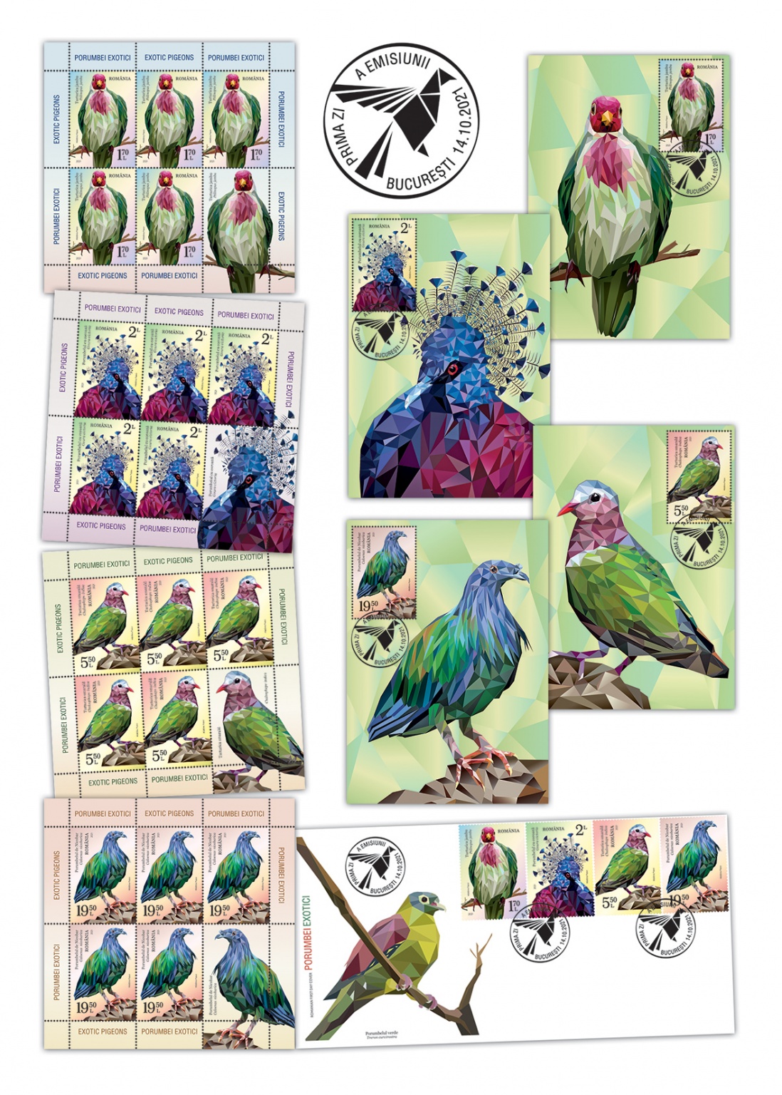 The postage stamps issue “Exotic pigeons will be available on Thursday, 14th Octomber 2021, in Romfilatelia’s shops network in Bucharest, Bacau, Brasov, Cluj-Napoca, Iasi and Timisoara and online on https://romfilatelia.ro/store/.