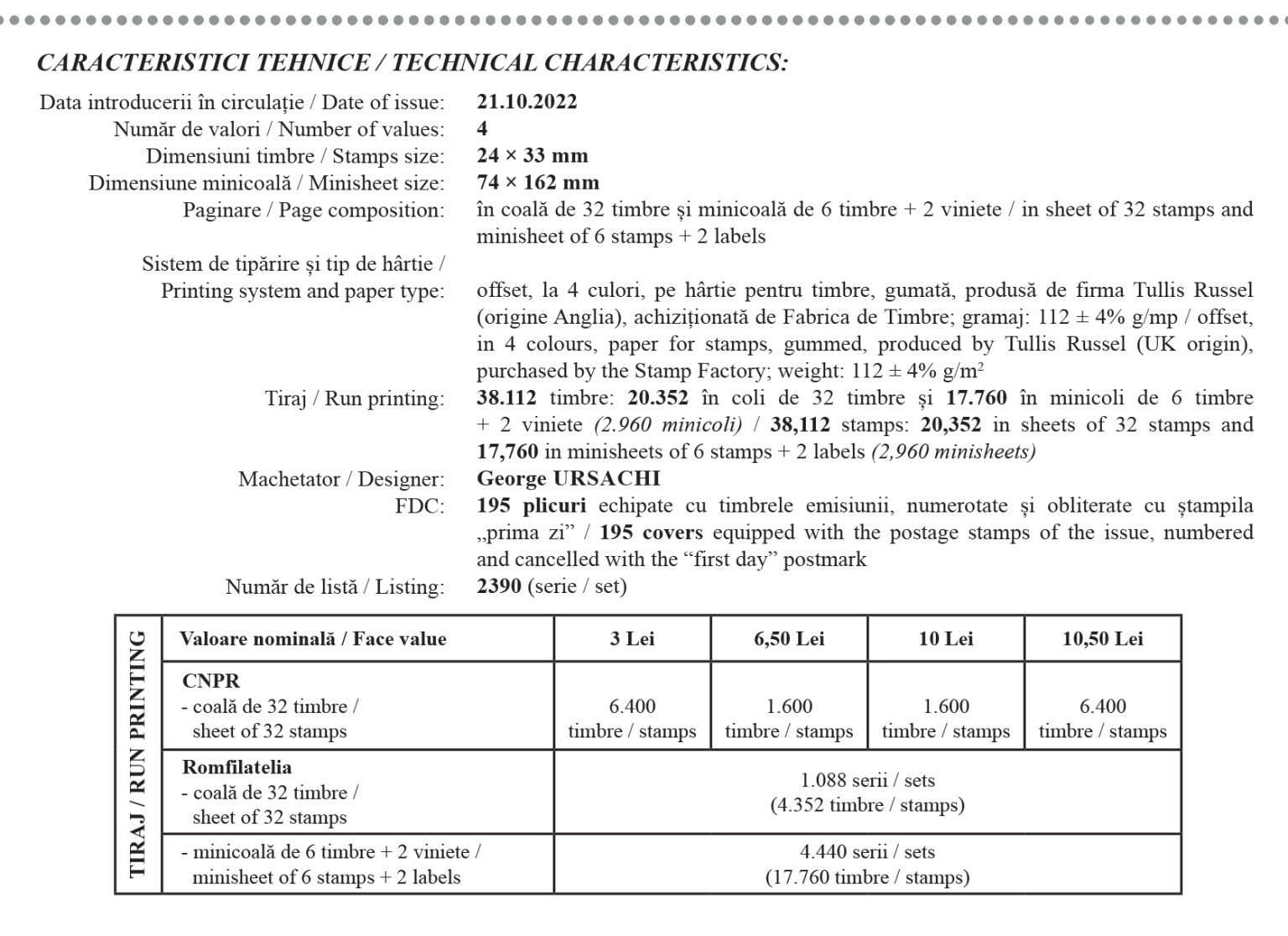 The philatelic issue will be available starting Friday, 21st of October, in Romfilatelia’s shops network in Bucharest, Bacau, Brasov, Cluj-Napoca, Iasi and Timisoara and online on https://romfilatelia.ro/store/.