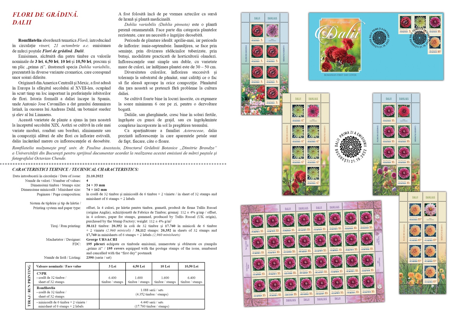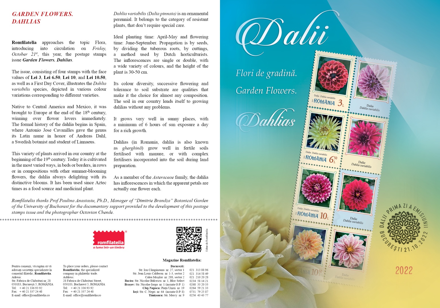 The issue, consisting of four stamps with the face values of Lei 3, Lei 6.50, Lei 10, and Lei 10.50, as well as a First Day Cover, illustrates the Dahlia variabilis species, depicted in various colour variations corresponding to different varieties.