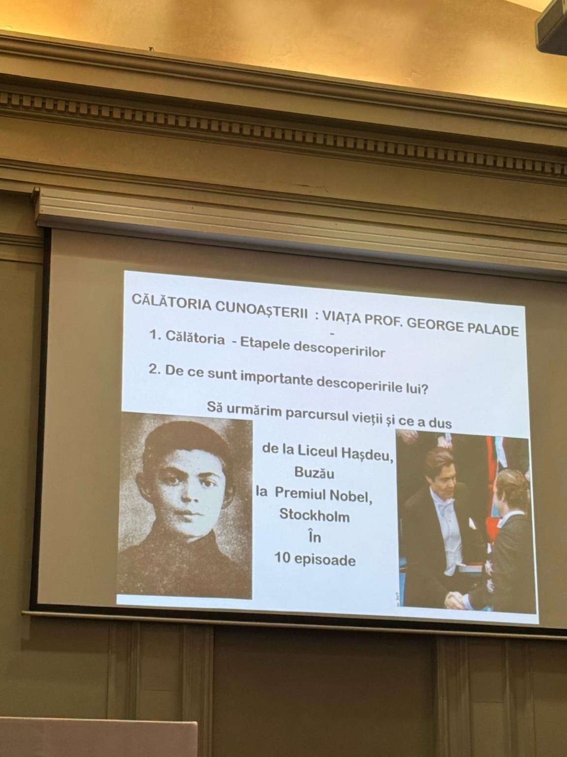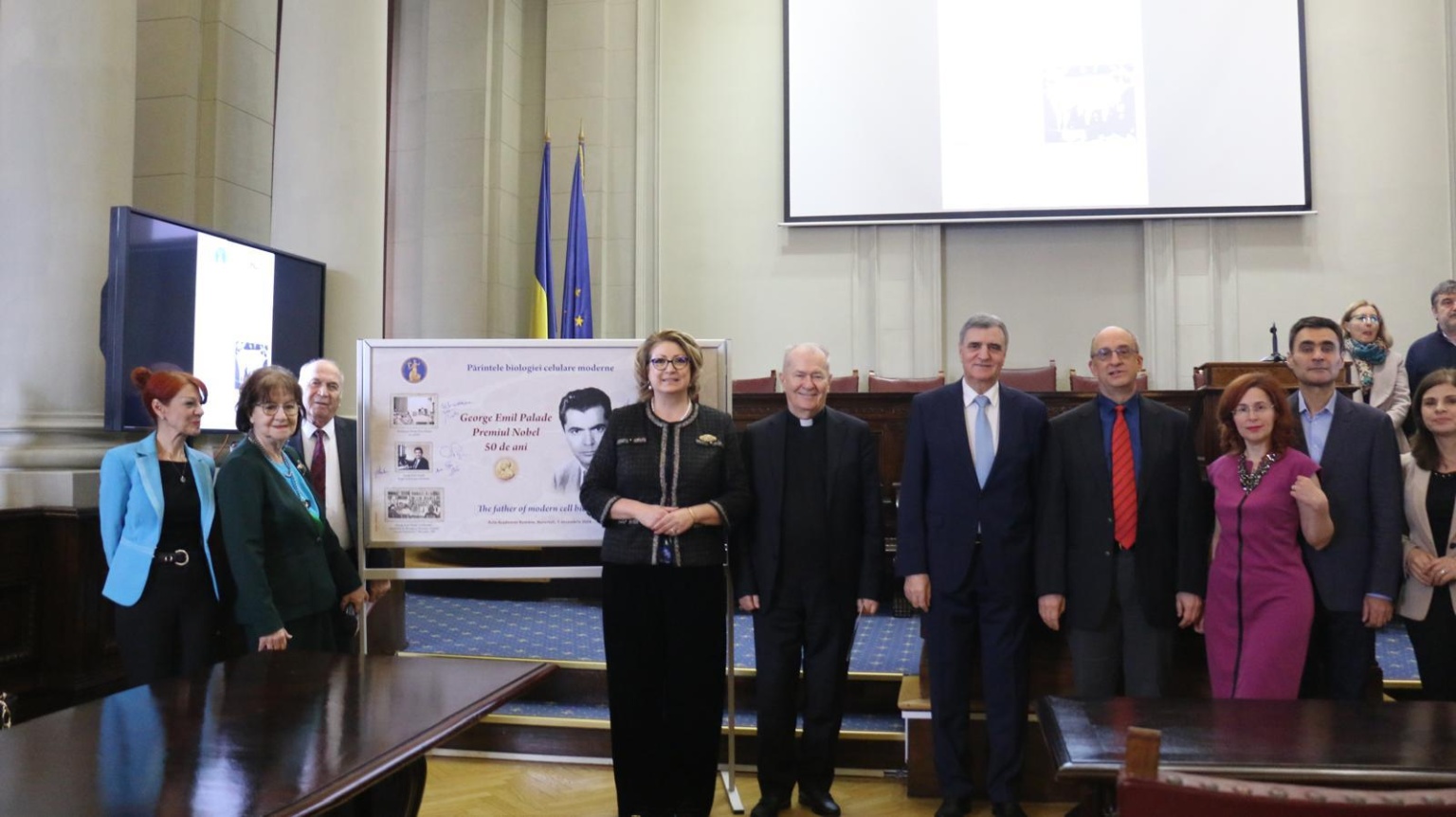 The following speakers delivered speeches, recalling the remarkable activity of the Romanian-born scientist, Nobel Prize winner in Medicine or Physiology: Acad. Ioan-Aurel Pop, President of the Romanian Academy; Acad. Maya Simionescu, President of the Biological Sciences Section and moderator of the event; Prof. Ștefan Constantinescu, Honorary Member of the Romanian Academy; Acad. Octavian Popescu; Acad. Ileana Mânduțeanu; Prof. Alexandru Babeș, Corresponding Member of the Romanian Academy; and Prof. Dragoș Vinereanu, Corresponding Member of the Romanian Academy.