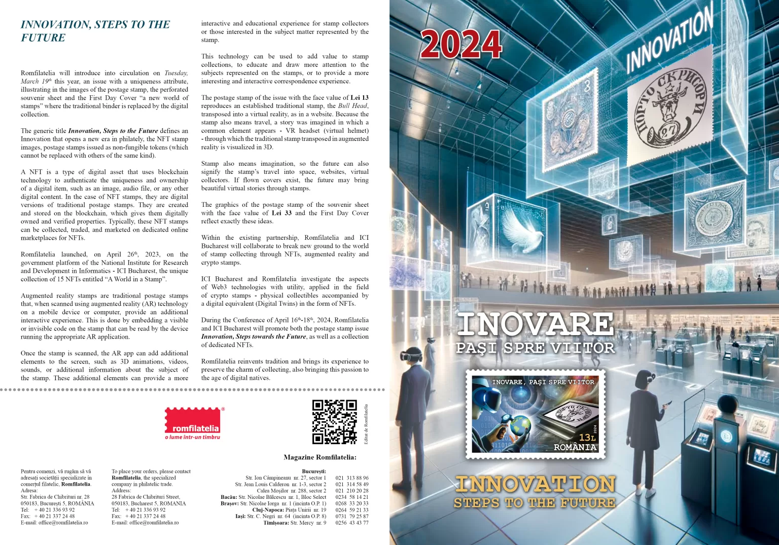 During the Conference of April 16th-18th, 2024, Romfilatelia and ICI Bucharest will promote both the postage stamp issue Innovation, Steps towards the Future, as well as a collection of dedicated NFTs.