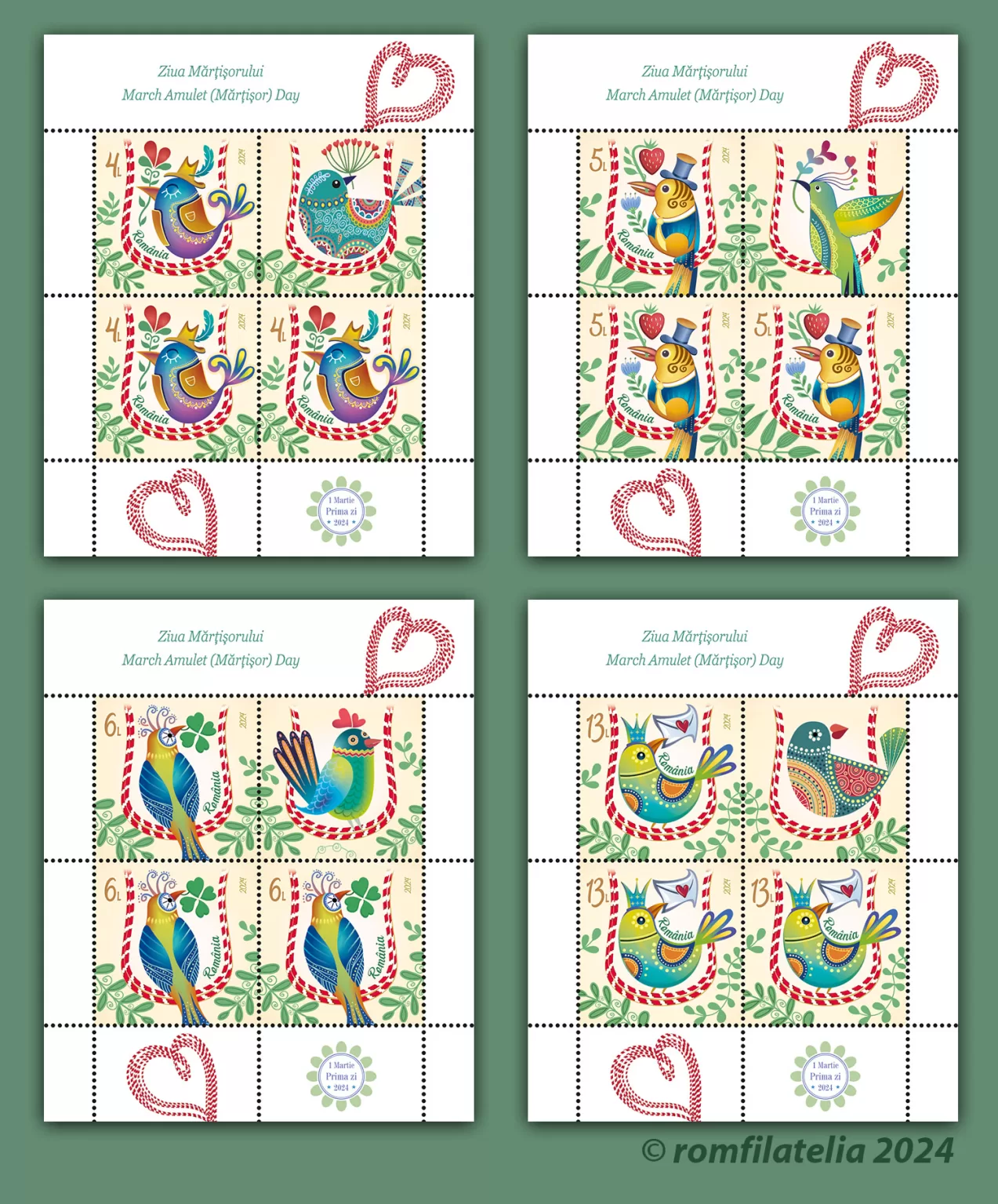 This year, on Friday, March 1st, Romfilatelia will introduce into circulation the March Amulet (Mărțișor) Day postage stamps issue, consisting of 4 stamps (with face values of Lei 4, Lei 5, Lei 6 and Lei 13), 1 First Day Cover and a special product in limited edition, unique philatelic March amulets for all friends of the Romanian stamp.