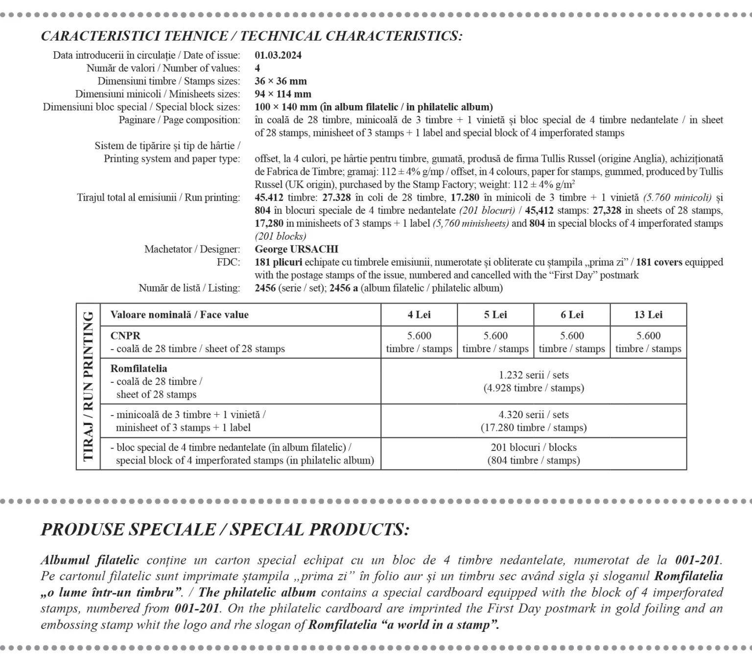 The philatelic issue will be available starting with Friday, March 1st, this year, in Romfilatelia’s shops network in Bucharest, Bacău, Brașov, Cluj-Napoca, Iași and Timișoara and online on https://romfilatelia.ro/store/.