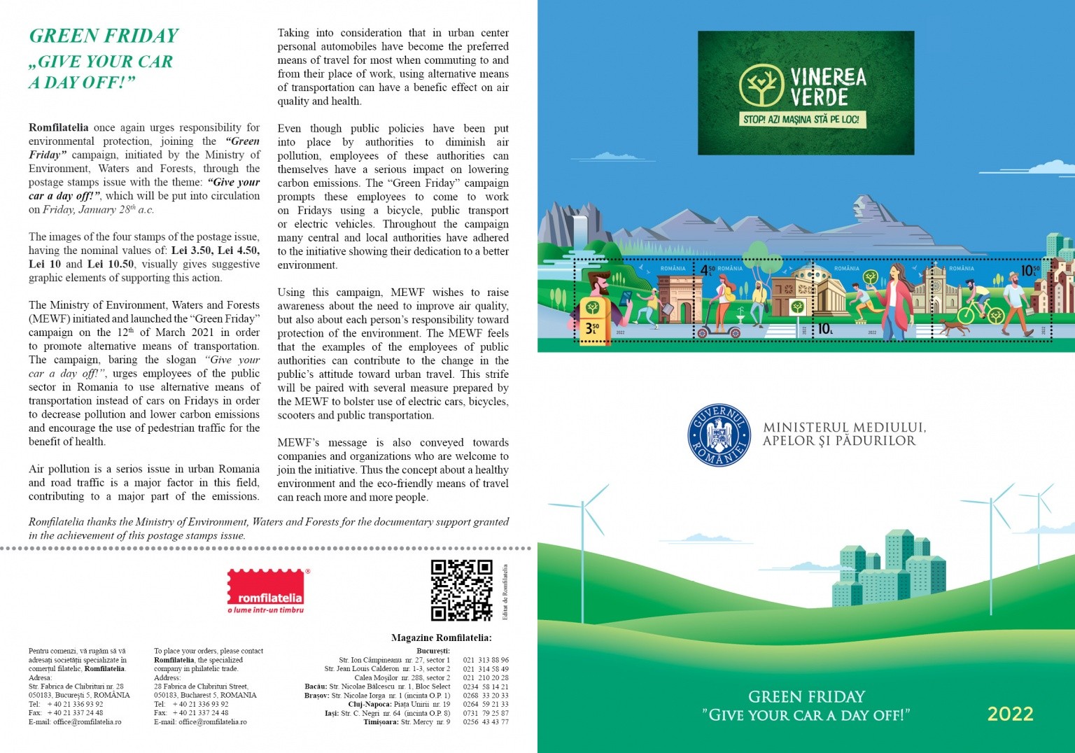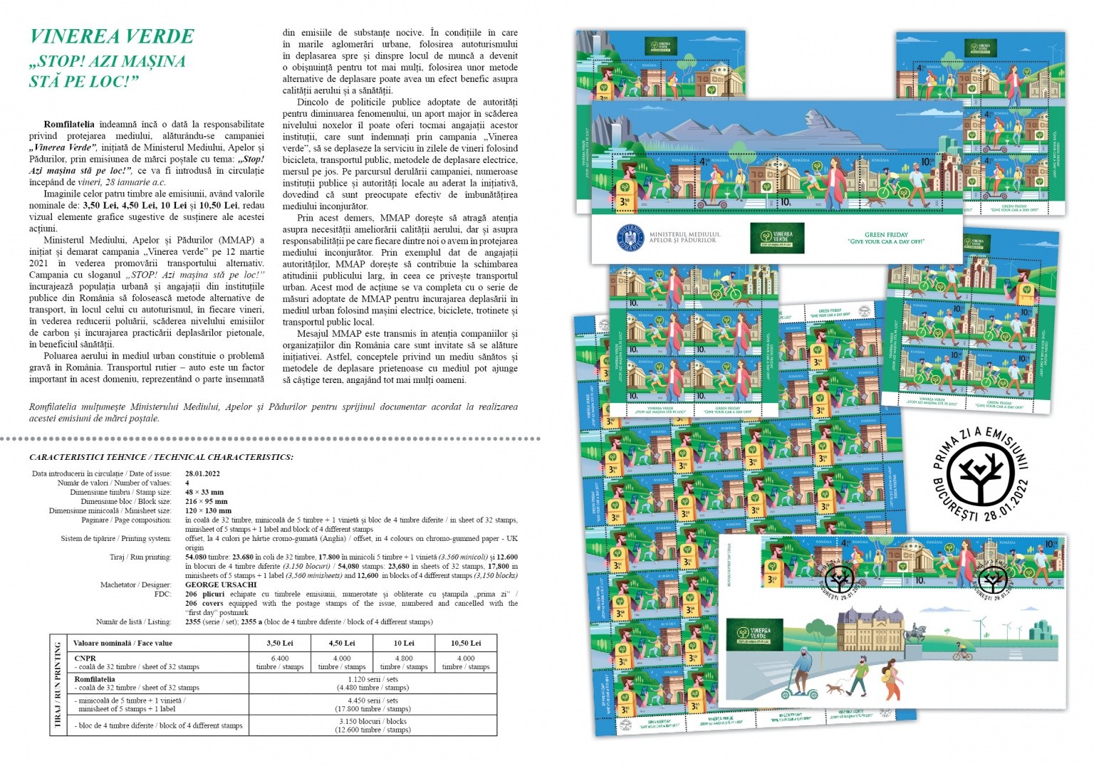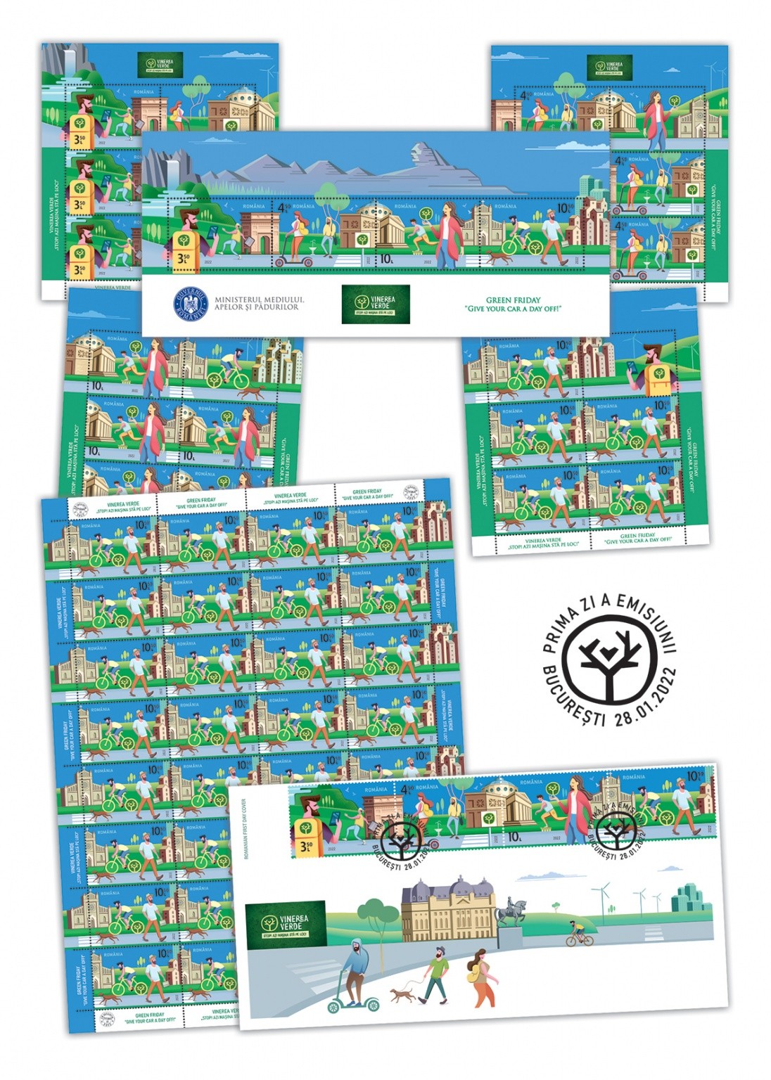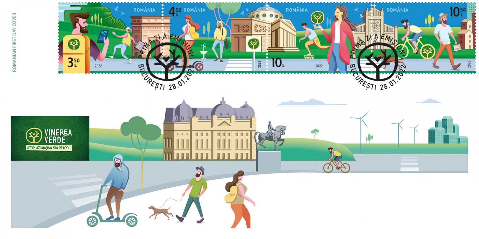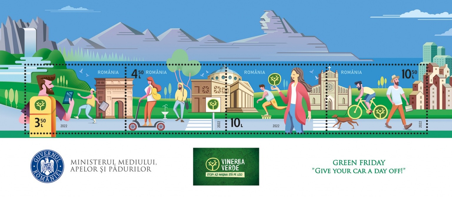 Romfilatelia once again urges responsibility for environmental protection, joining the “Green Friday” campaign, initiated by the Ministry of Environment, Waters and Forests, through the postage stamps issue with the theme: “Give your car a day off!”, which will be put into circulation on Friday, January 28th a.c.