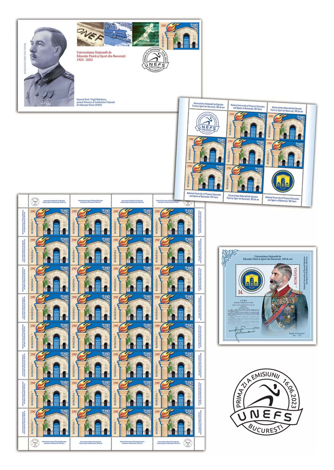 In the graphic composition of the perforated souvenir sheet having the stamp with the face value of Lei 34, the bust of King Ferdinand I, the signatory of the Law on Physical Education, is illustrated, alongside a facsimile of the text of the Law. The UNEFS anniversary logo is reproduced in the perforation of the stamp of the souvenir sheet.