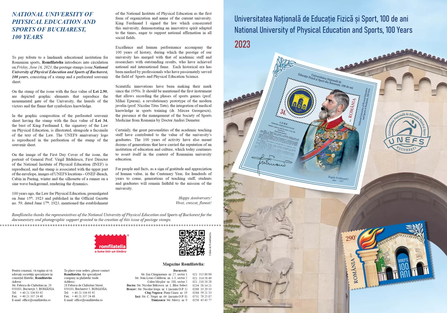 The philatelic issue will be available starting with Friday, June 16th, 2023, in Romfilatelia’s shops network in Bucharest, Bacău, Brașov, Cluj-Napoca, Iași and Timișoara and online on https://romfilatelia.ro/store/.