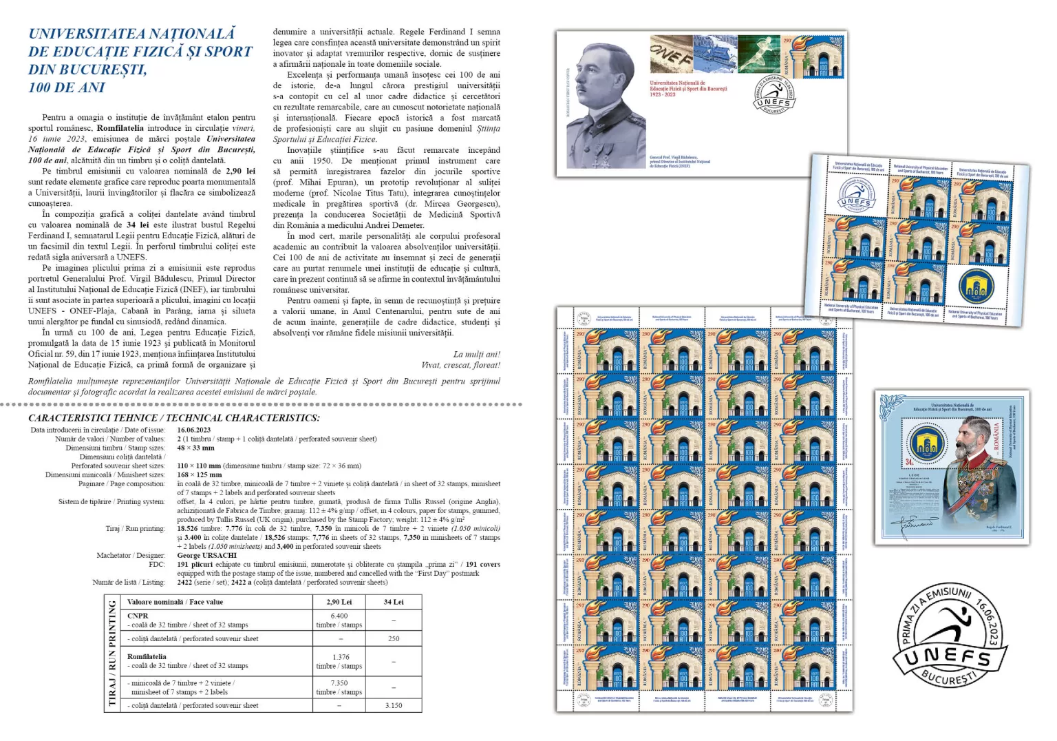 On the image of the First Day Cover of the issue, the portrait of General Prof. Virgil Bădulescu, First Director of the National Institute of Physical Education (INEF) is reproduced, and the stamp is associated with the upper part of the envelope, images of UNEFS locations – ONEF-Beach, Cabin in Parâng, winter and the silhouette of a runner on a sine wave background, rendering the dynamics.