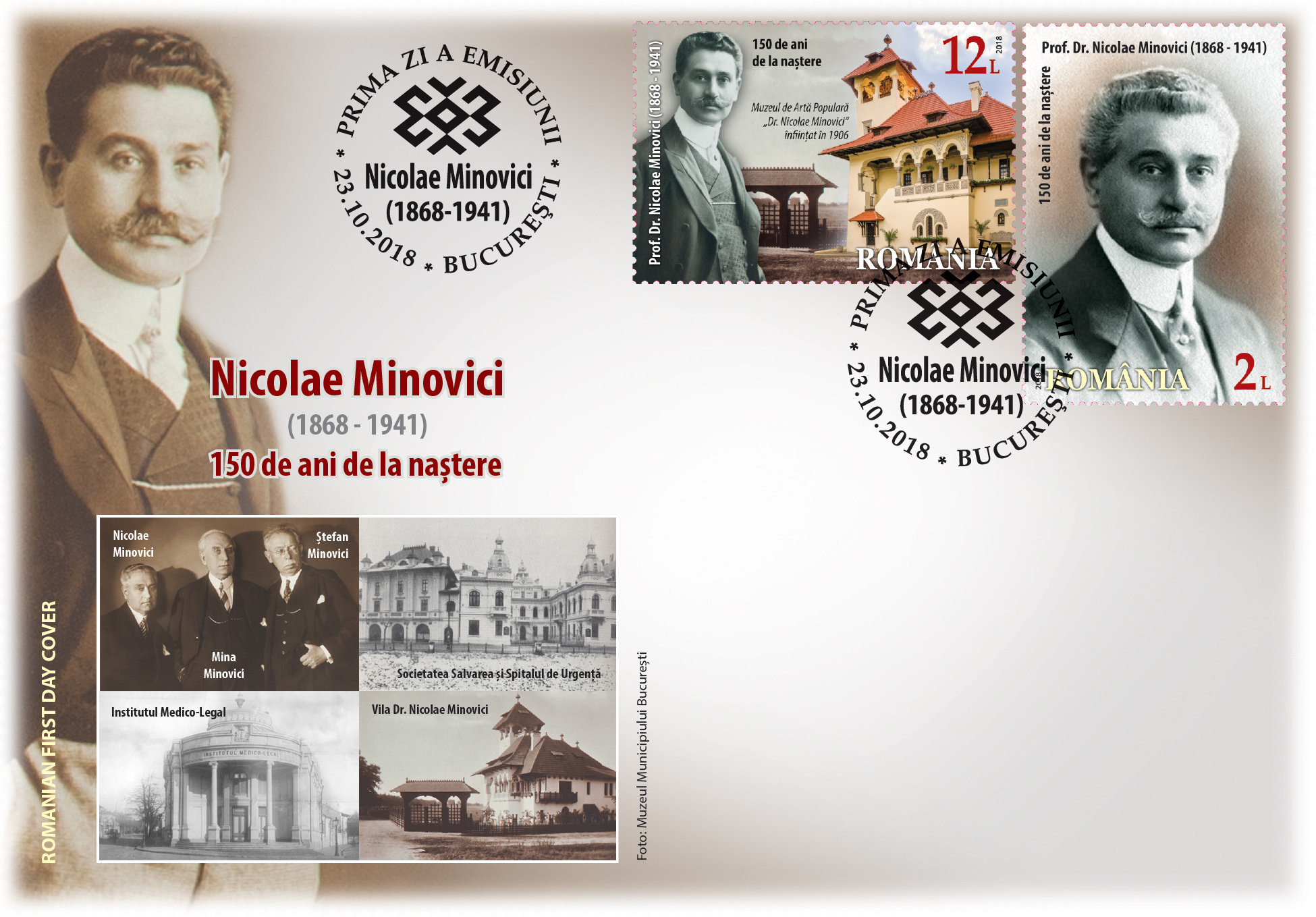 The first stamp of the issue, with the face value of Lei 2.00, illustrates the portrait of Prof. Dr. Nicolae Minovici and the second stamp of the issue, with the face value Lei 12.00, reproduce the image of the Villa with the bells, today the “Dr. Nicolae Minovici” Folk Art Museum, alongside another portrait of the founder of this institution.