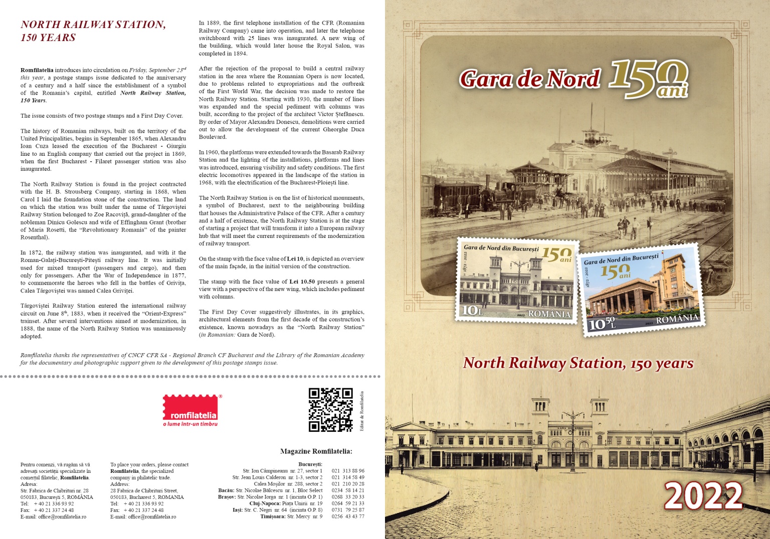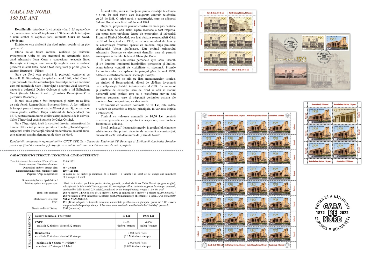 Romfilatelia thanks the representatives of CNCF CFR SA – Regional Branch CF Bucharest and the Library of the Romanian Academy for the documentary and photographic support given to the development of this postage stamps issue.