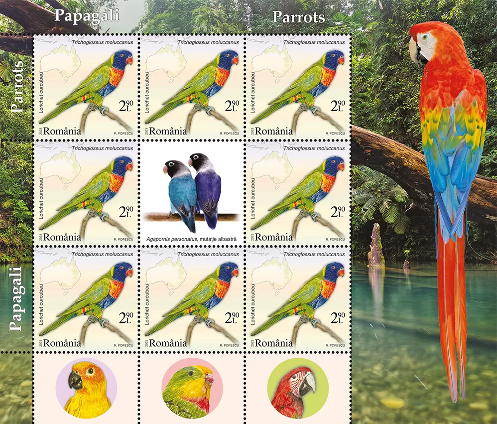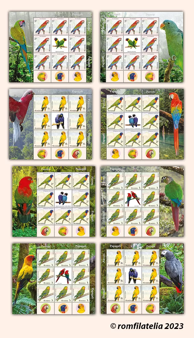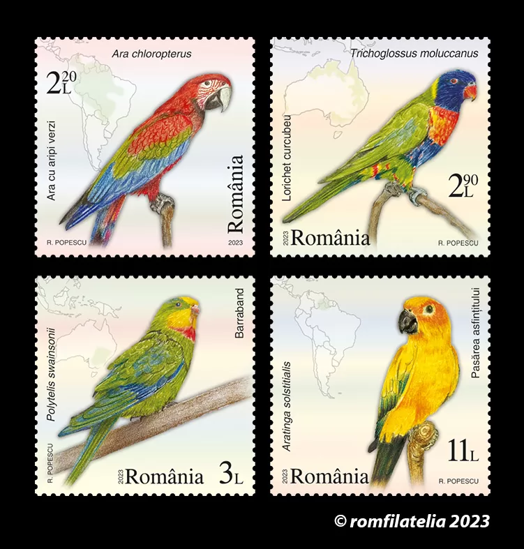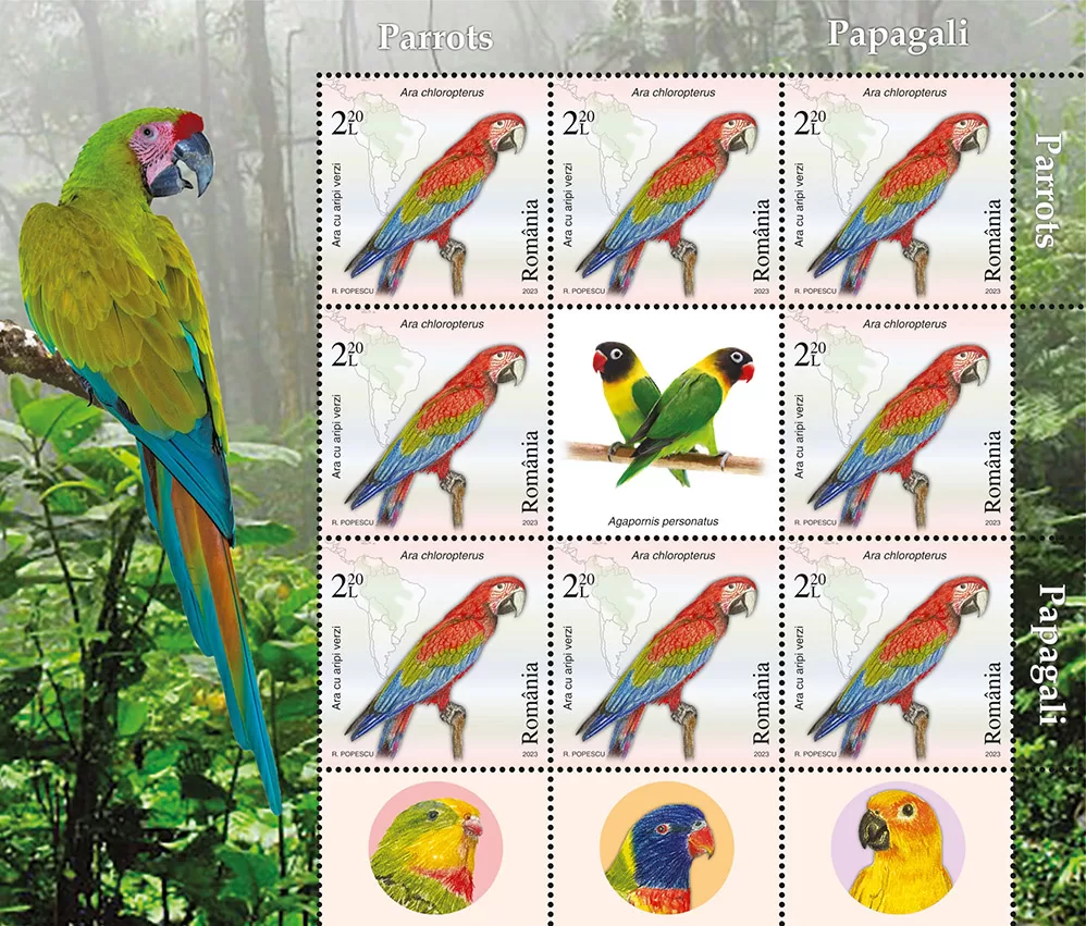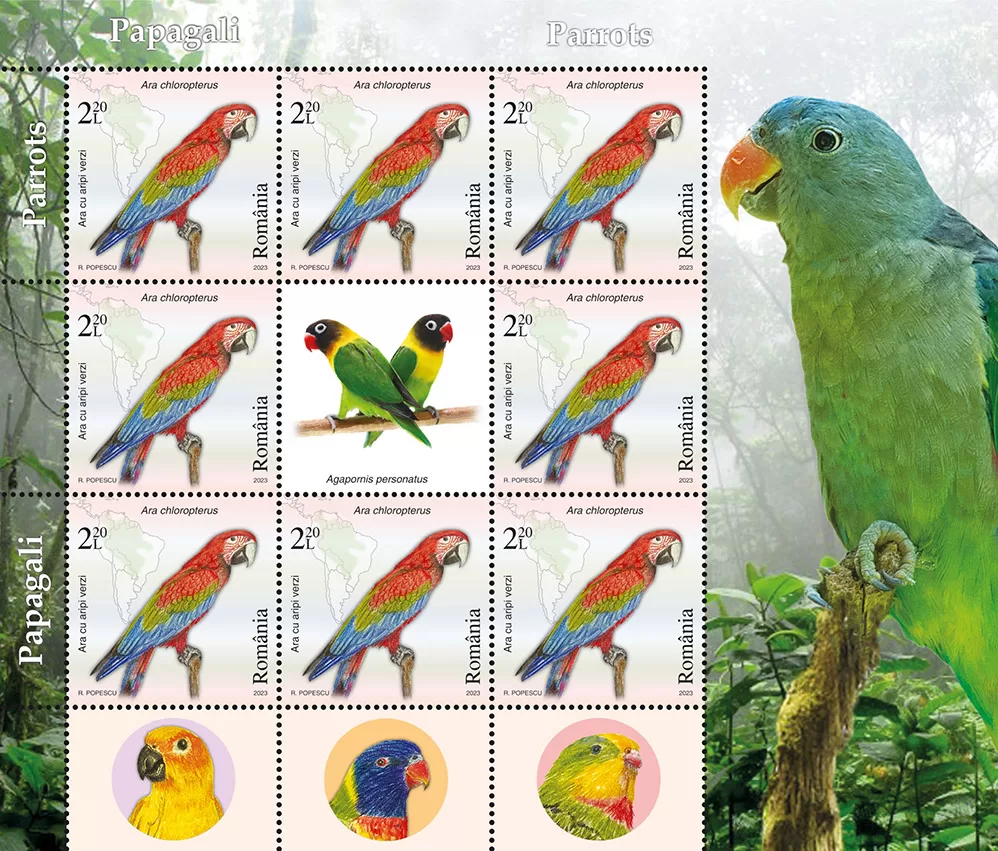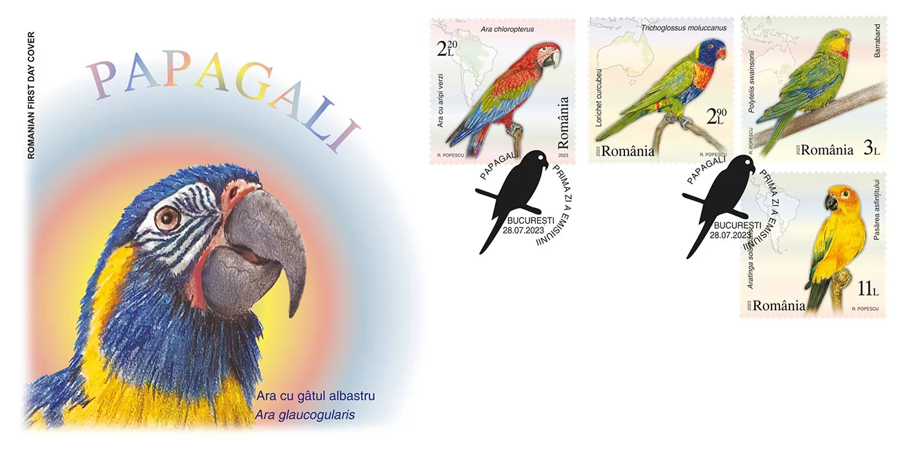 Romfilatelia introduces into circulation on Friday, July 28th, 2023, an interesting issue on the theme of Fauna, entitled “Parrots”, consisting of four postage stamps, a First Day Cover, minisheets designed in two layout versions, as well as a collection philatelic folder.