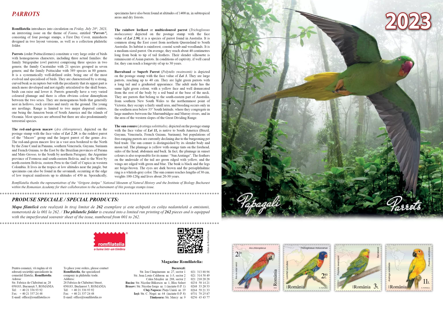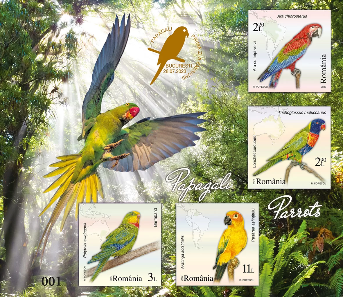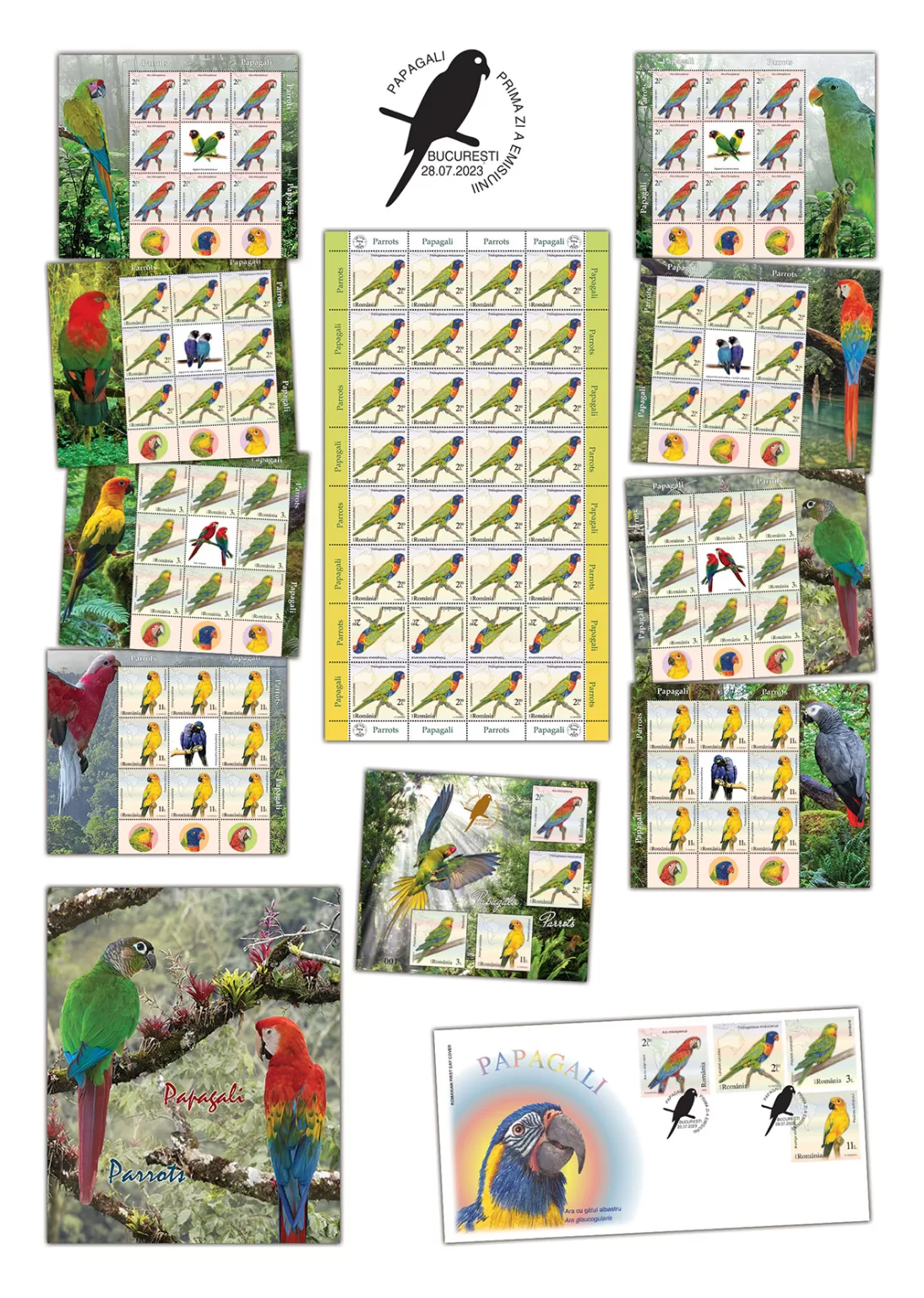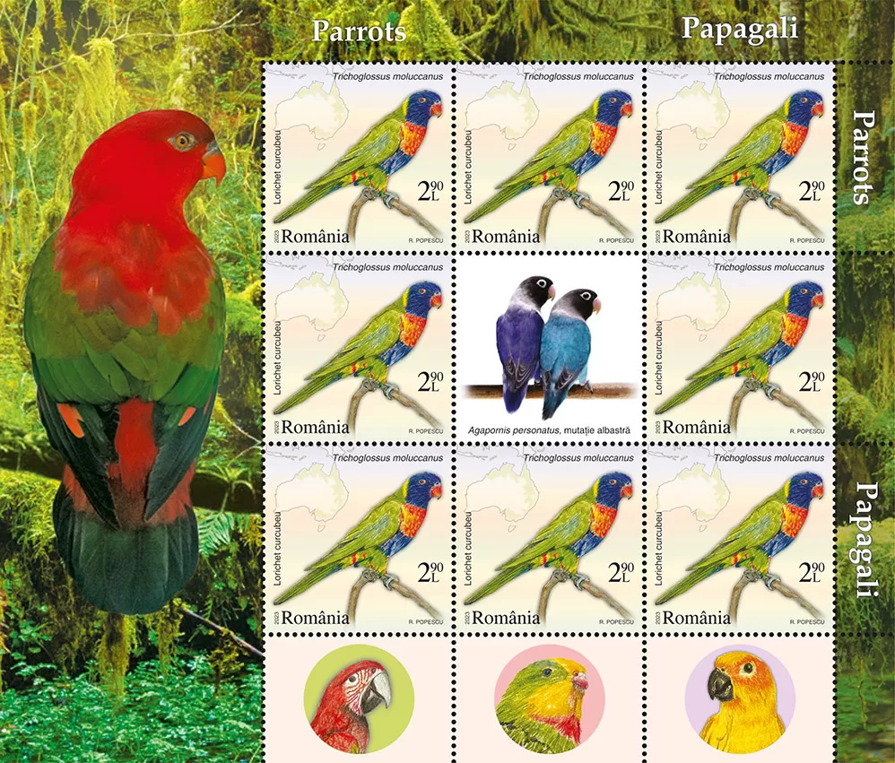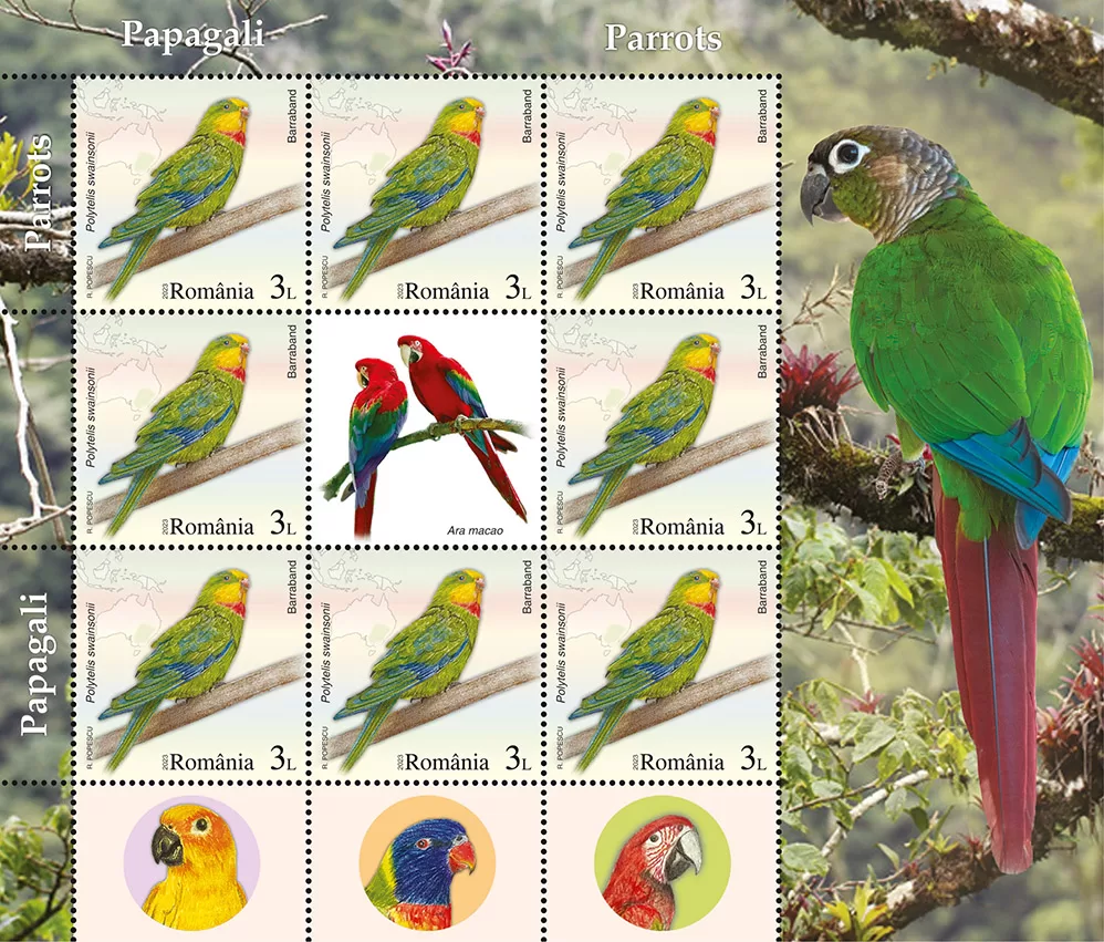 Romfilatelia introduces into circulation on Friday, July 28th, 2023, an interesting issue on the theme of Fauna, entitled “Parrots”, consisting of four postage stamps, a First Day Cover, minisheets designed in two layout versions, as well as a collection philatelic folder.