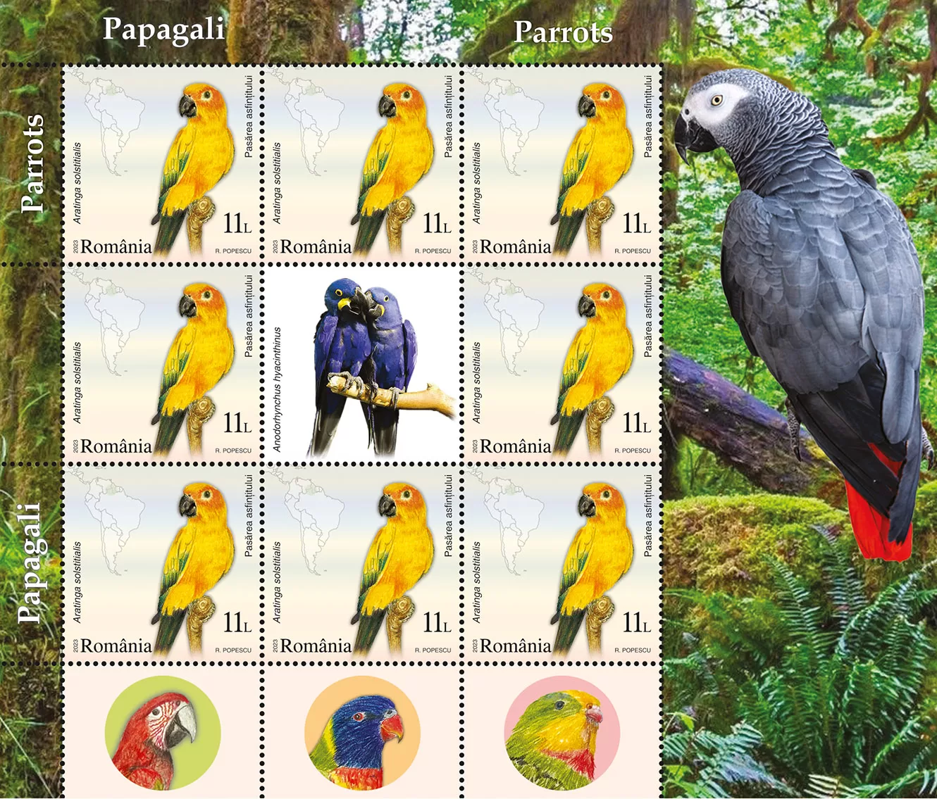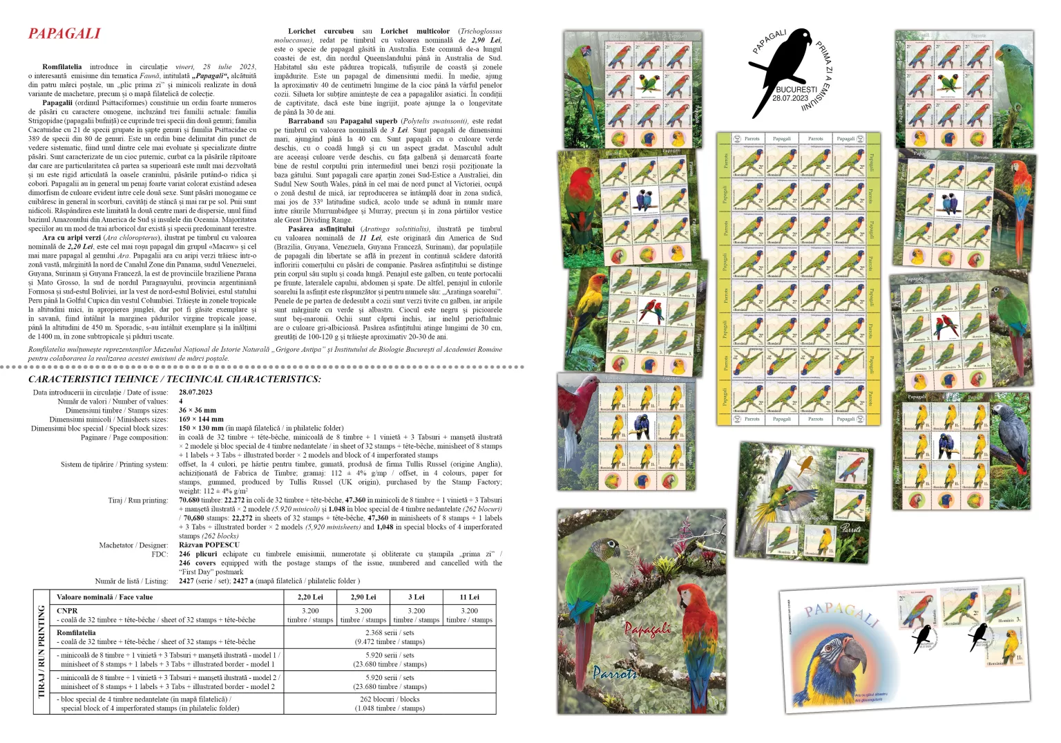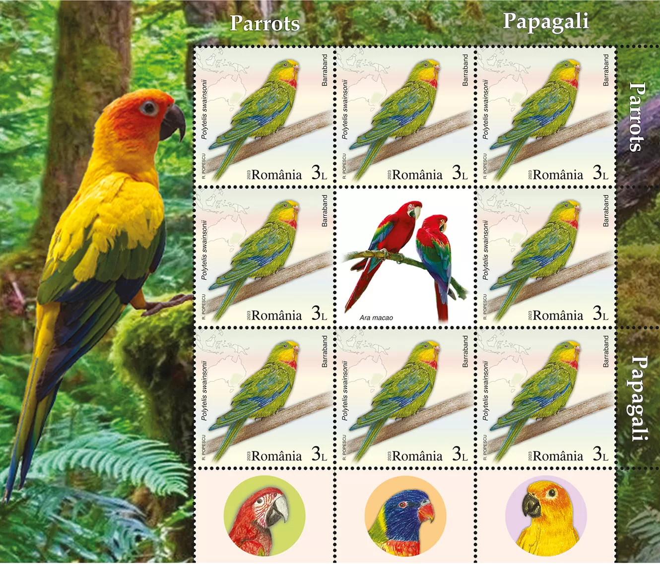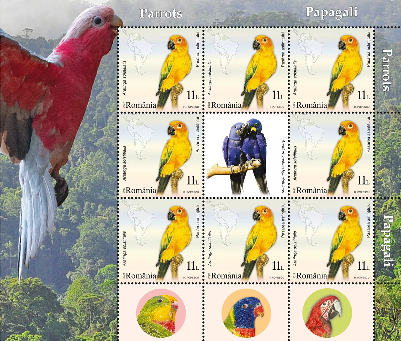 Romfilatelia introduces into circulation on Friday, July 28th, 2023, an interesting issue on the theme of Fauna, entitled “Parrots”, consisting of four postage stamps, a First Day Cover, minisheets designed in two layout versions, as well as a collection philatelic folder.
