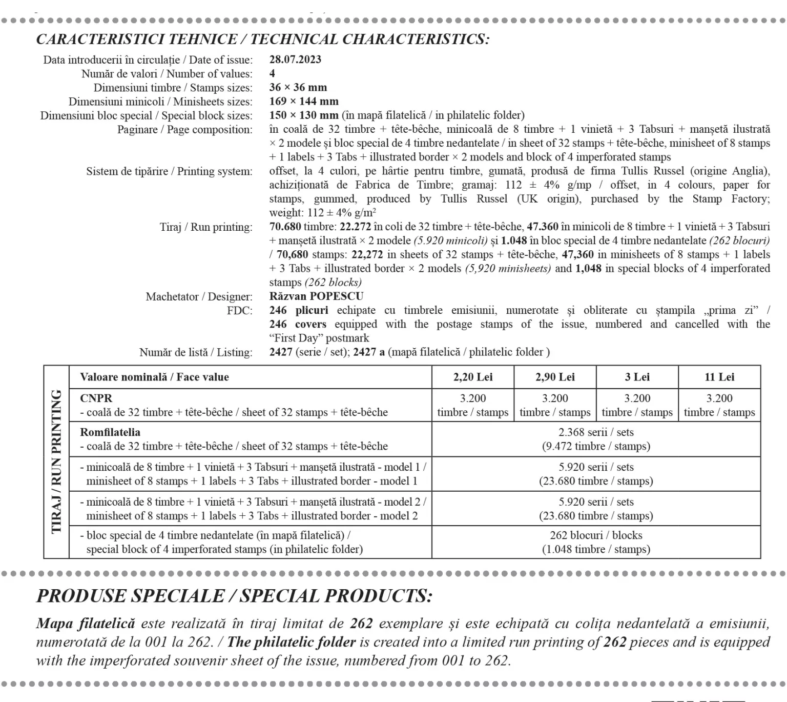 The philatelic issue will be available starting with Friday, July 28th, 2023, in Romfilatelia’s shops network in Bucharest, Bacău, Brașov, Cluj-Napoca, Iași and Timișoara and online on https://romfilatelia.ro/store/.