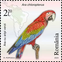 The red-and-green macaw (Ara chloropterus), depicted on the postage stamp with the face value of Lei 2.20, is the reddest parrot of the “Macaw” group and the largest parrot of the genus Ara.