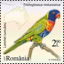 The rainbow lorikeet or multicoloured parrot (Trichoglossus moluccanus) depicted on the postage stamp with the face value of Lei 2.90, it is a species of parrot found in Australia.
