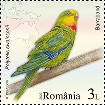 Barraband or Superb Parrot (Polytelis swainsonii) is depicted on the postage stamp with the face value of Lei 3. They are large parrots, reaching up to 40 cm.