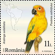 The sun conure (Aratinga solstitialis), depicted on the postage stamp with the face value of Lei 11, is native to South America (Brazil, Guyana, Venezuela, French Guiana, Surinam), but populations of free-ranging parrots are currently declining due to the burgeoning pet bird trade. The sun conure is distinguished by its slender body and moon tail.