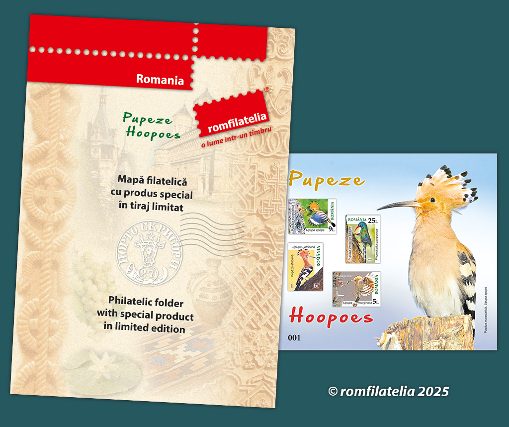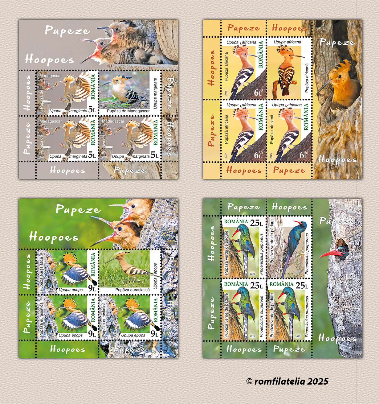 Romfilatelia introduces into circulation a postage stamps issue on Wednesday, March 12th this year, under the Fauna theme, titled Hoopoes. The issue consists of 4 postage stamps, 4 maxicards, for maximaphilia enthusiasts, a philatelic folder with special product in a limited edition and a First Day Cover. The images of the postage stamps show birds