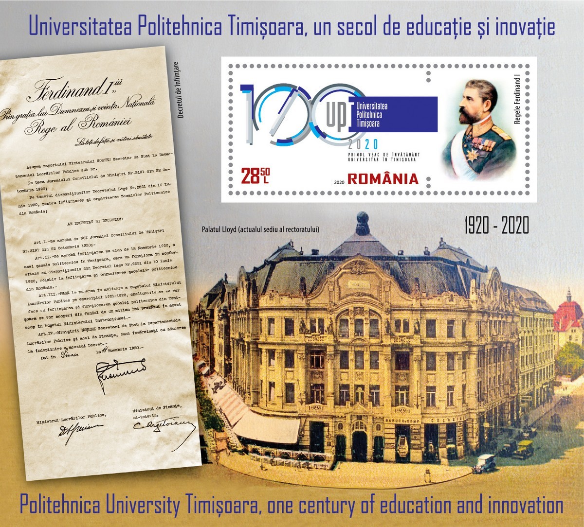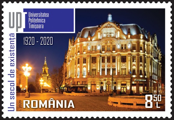 The postage stamps issue, that contains a stamp and a perforated souvenir sheet, is dedicated to the anniversary of the Politehnica University Timișoara, which celebrates, this year, a century since its establishment and marks the Centenary of the first higher education institution in the west of the country.