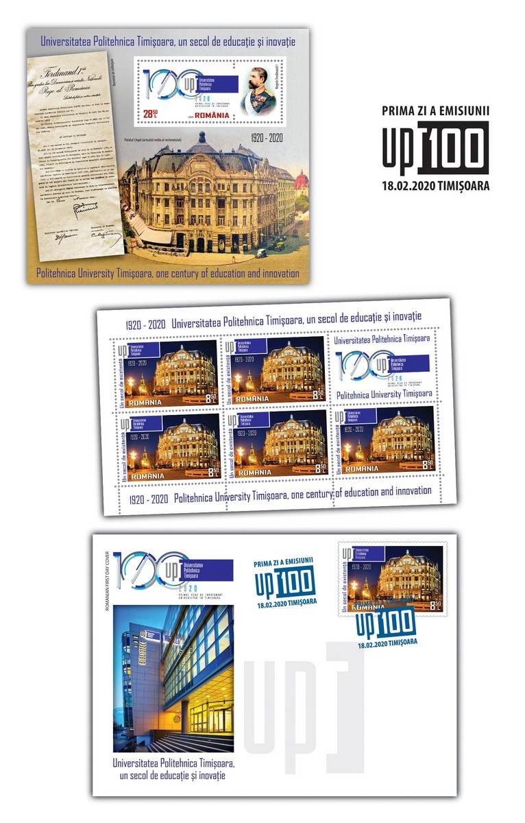 The postage stamps issue “Politehnica University Timișoara, one century of education and innovation” will be available on Tuesday, February 18th 2020, in Romfilatelia’s shops network in Bucharest, Bacau, Brasov, Cluj-Napoca, Iasi and Timisoara and online on https://romfilatelia.ro/store/. The postage stamps issue is completed by “first day” cover, and as page composition in sheet of 32 stamps, minisheet of 5 stamps + 1 label and perforated souvenir sheet.
