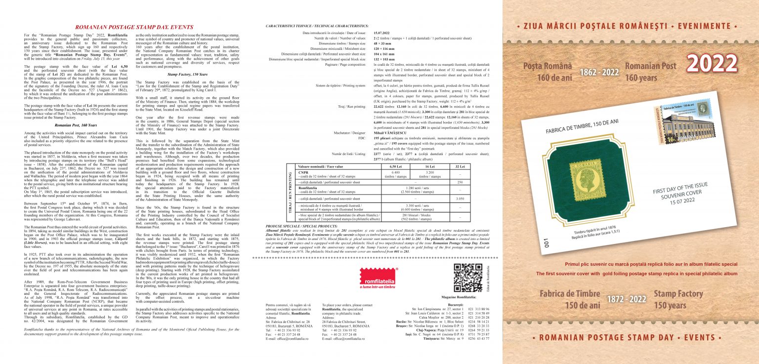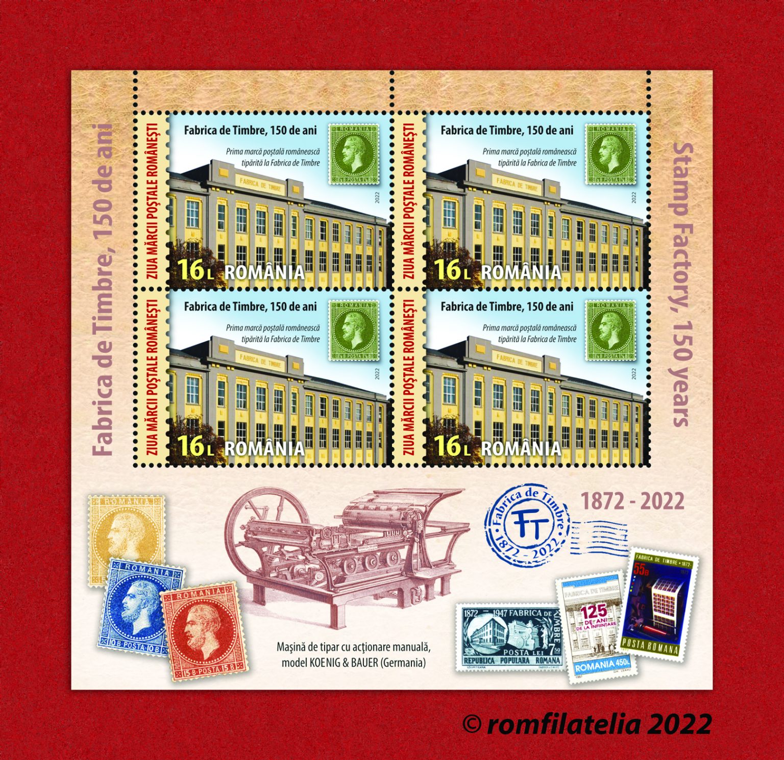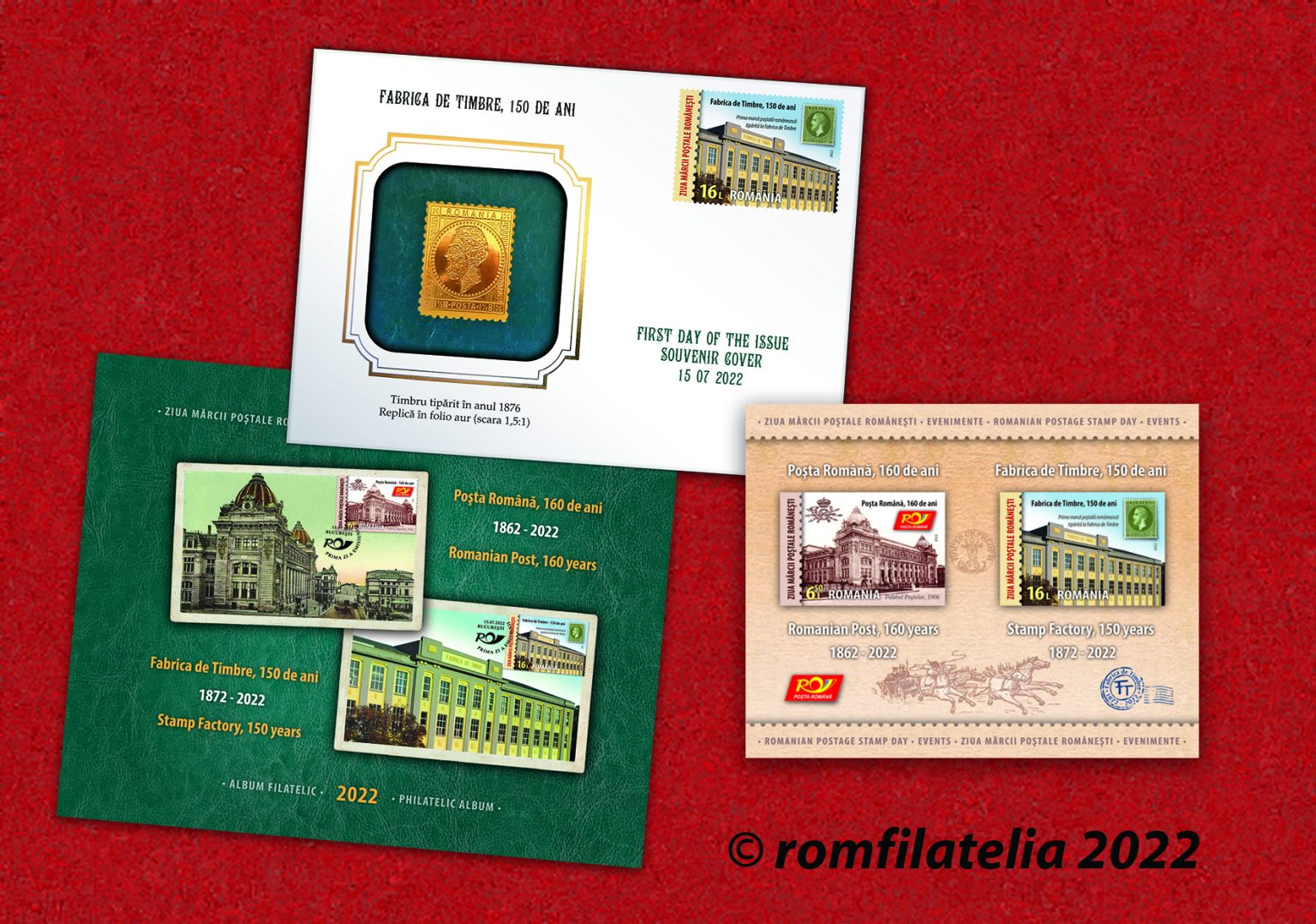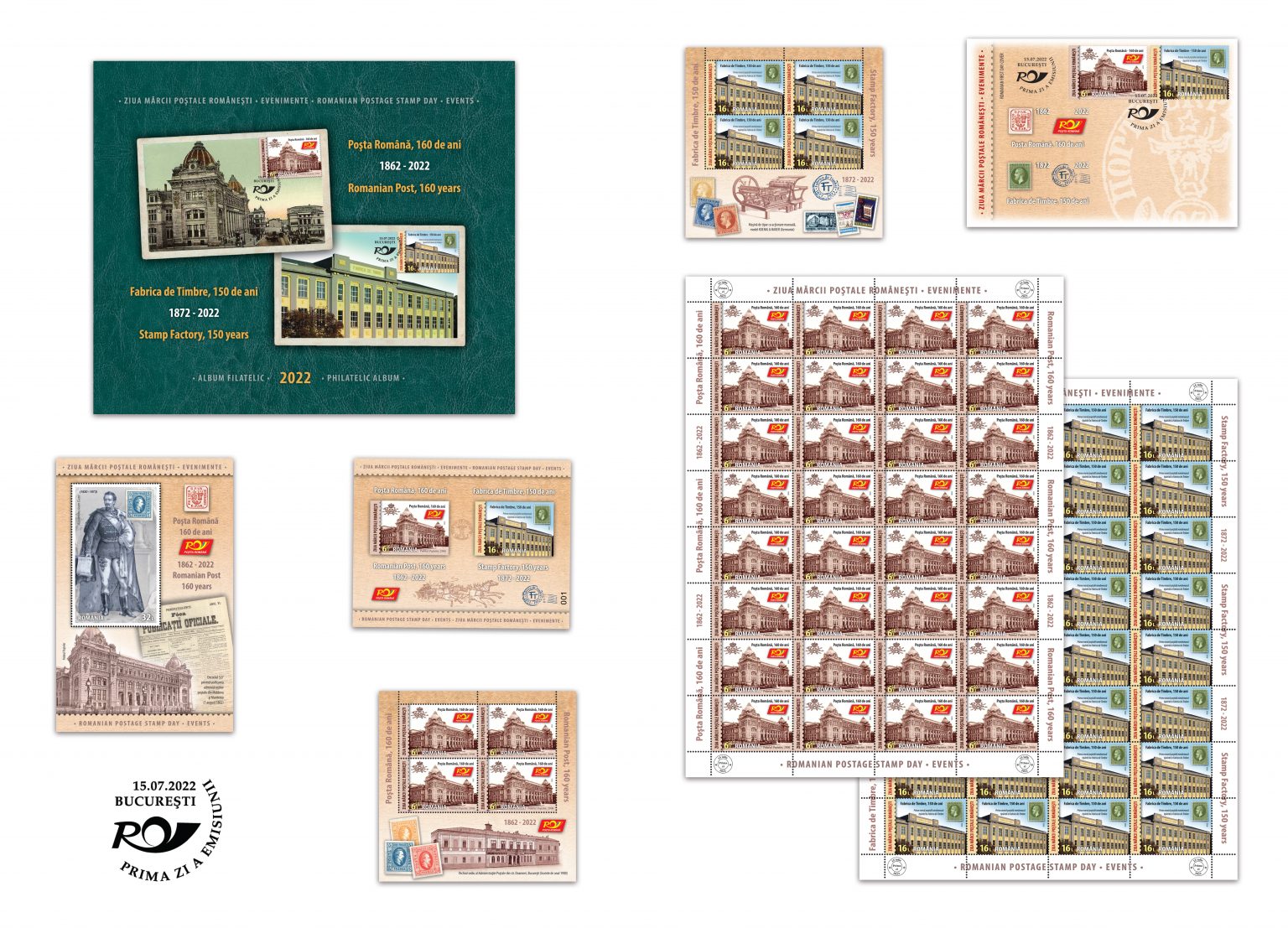 On the occasion of the “Romanian Postage Stamp Day” 2022, Romfilatelia, designated by the Romanian Government as the only institution authorized to issue Romanian postage stamps, provides to the general public and passionate collectors, an anniversary issue dedicated to the Romanian Post and the Stamp Factory, which sign up 160 and respectively 150 years since their establishment.