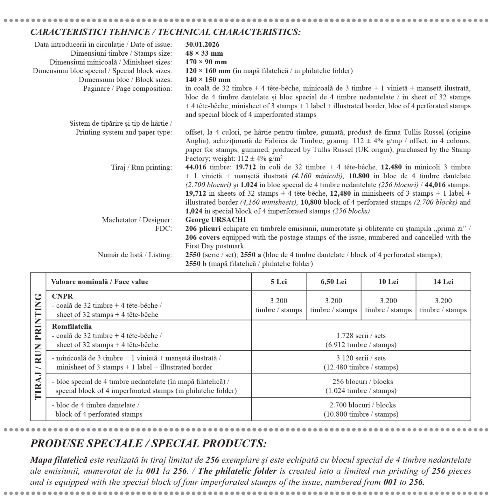 Romfilatelia thanks First Degree Scientific Researcher Luis Ovidiu Popa, Director of the ‘Grigore Antipa’ National Museum of Natural History, and museographer Alexandru Iftime, PhD, for their expert advice in the development of this postage stamp issue.