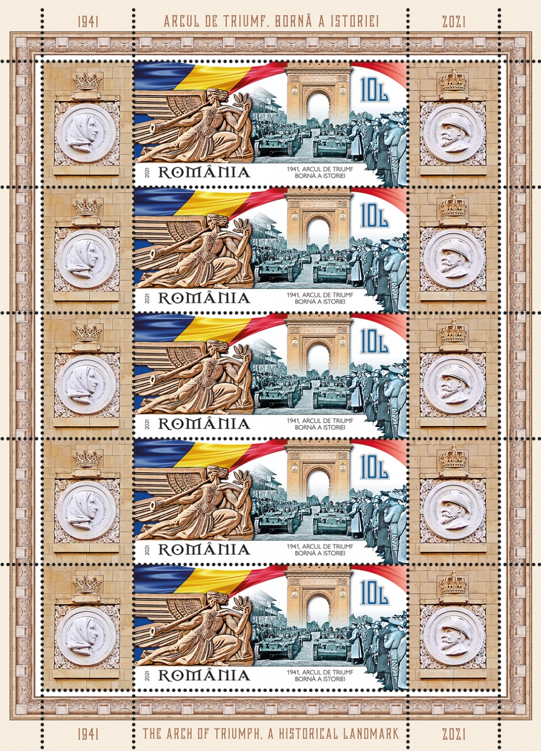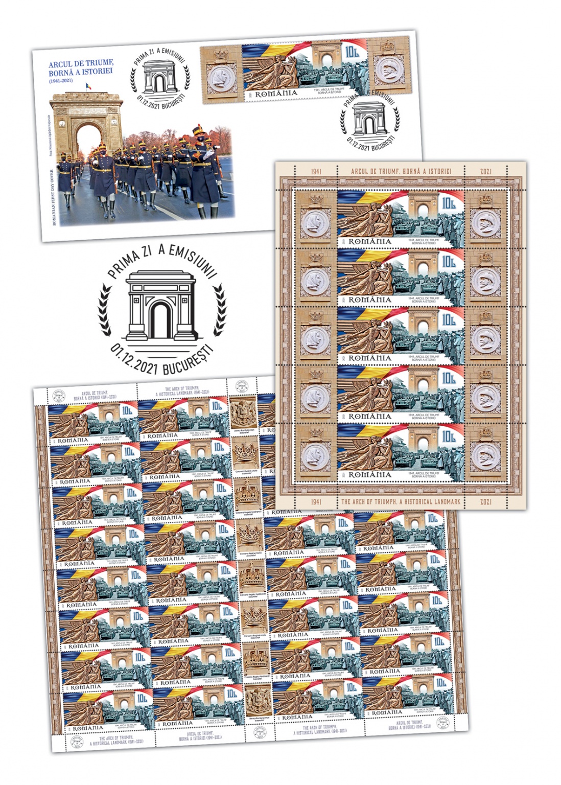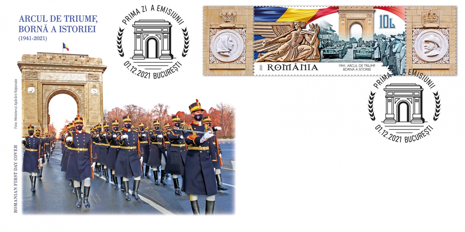 Thus, to celebrate the 80th anniversary of the first military parade, Romfilatelia, introduces into circulation, on December 1, 2021, the issue of postage stamps Arc de Triomphe, the landmark of history (1941-2021), in honor of the heroes who fell in battle for the liberation of Basarabia and the North of Bucovina.