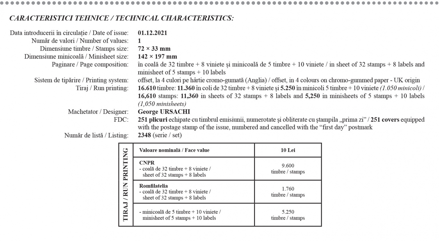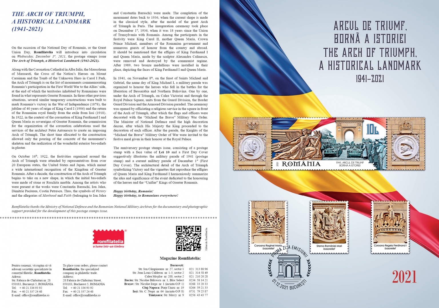 The postage stamps issue “The Arch of Triumph, a Historical Landmark (1941-2021)” will be available on Wednesday, 01th of December 2021, in Romfilatelia’s shops network in Bucharest, Bacau, Brasov, Cluj-Napoca, Iasi and Timisoara and online on https://romfilatelia.ro/store/.